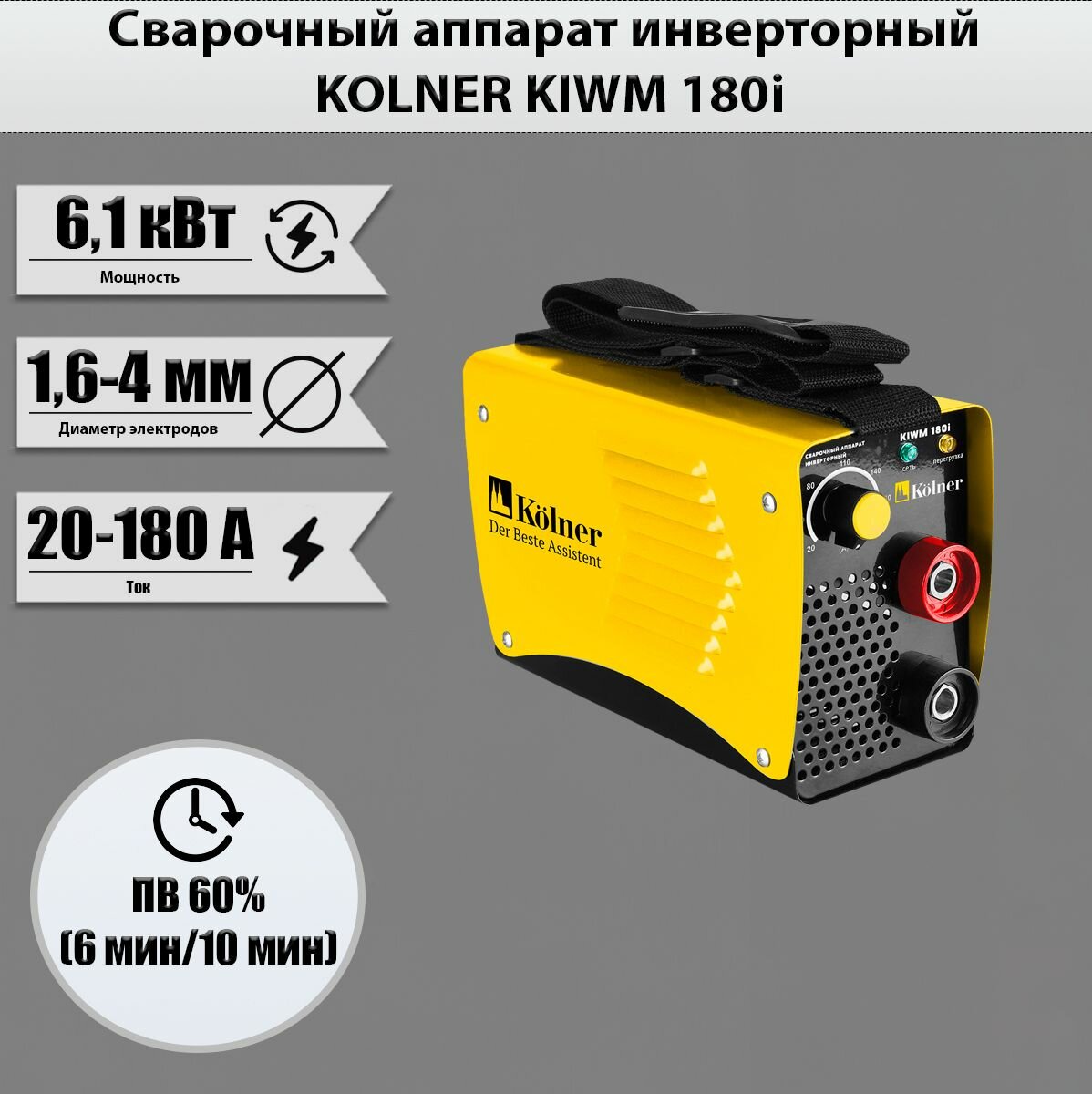 | Прочие особенности и свойства | Сварочный аппарат KOLNER KIWM 180i инверторный IGBT 6.1кВт 20-180А,,Напряжение сети, В:220±10%,Частота, Гц:50,Максимальная потребляемая мощность, кВт |