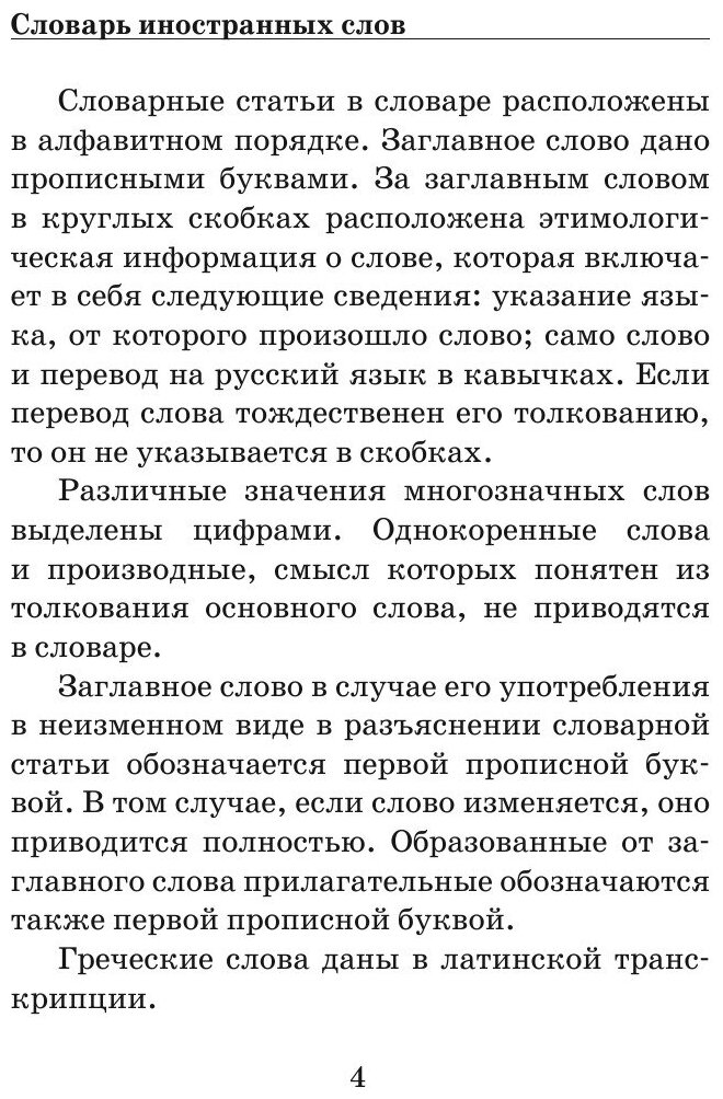 Словарь иностранных слов содержит более 5000 слов и терминов. В словарь включены интернациональные термины, образованные из элементов древнегреческого, латинского и частично из восточных и новых западноевропейских языков. Большая часть слов данного словаря принадлежит группе слов и терминов, которые являются общими для многих языков мира. Словарь предназначен для школьников, филологов, редакторов, корректоров и всех интересующихся.