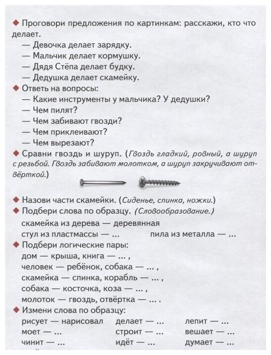 Работая с сюжетными картинками, ребенок отвечает на вопросы по содержанию изображения. Разнообразные упражнения направлены на знакомство со словообразованием, использованием в речи предлогов, на составление сравнительно-описательных рассказов, продолжение предложений по образцу и др.