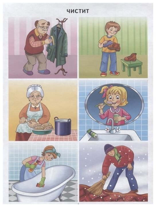 В пособии представлен иллюстративный материал для формирования глагольного словаря. Простые сюжеты позволяют ребенку составить самостоятельно или повторить за взрослым и запомнить короткие предложения. Работа с пособием предусматривает обогащение словаря ребенка следующими глаголами: "везёт", "чистит", "слушает", "делает", "катается", "гладит", "собирает", "лепит", "вырезает", "поёт", "рисует", "играет", "качается" и др., которые также часто используются в разговорах с детьми.