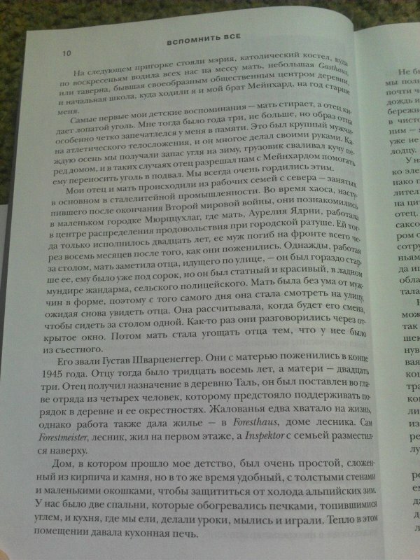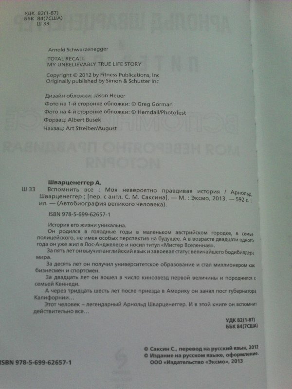 Имел удовольствие прочесть эту книгу в оригинале в электронном виде еще до российского издания. Читалось взахлеб. Интересно было сопоставить официальную автобиографию с вариантом биографии от Венди Лэй, в свое время получившим широкое распространение в России, и зачитанную в подростковом возрасте до дыр. Купив отечественное издание, был приятно удивлен качеством исполнения. Ожидал, что книга будет менее габаритная:))) Перевод в целом не плох, но в части, посвященной спортивной карьере автора, чувствуется, что переводчик "не в теме" специфики бодибилдинга. Думаю, книга будет прекрасным подарком для большинства мужчин.