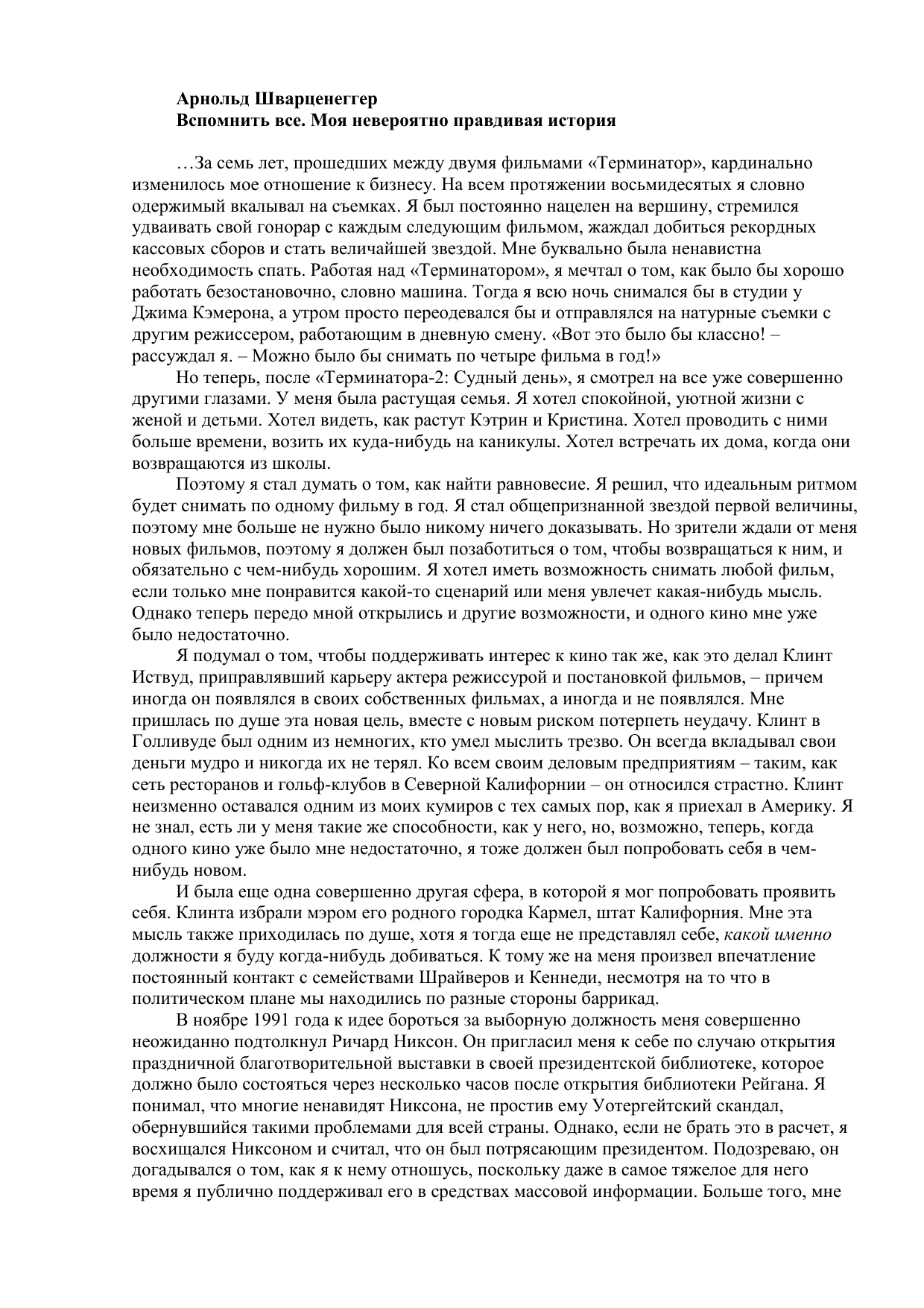 В общем, все что изложено на 1000 страницах – всего лишь его обобщенные рассказы о себе за прошедшие годы. Этакий политический пиар себя хорошего. Никакой невероятно правдивой истории и в помине нет. Интересующиеся биографией этого человека врятли найдут тут что-то новое. Рекомнедую лучше почитать книгу Венди Лей «Неофициальная биография Арнольда Шварценеггера», из-за которой он судился но проиграл дело. -