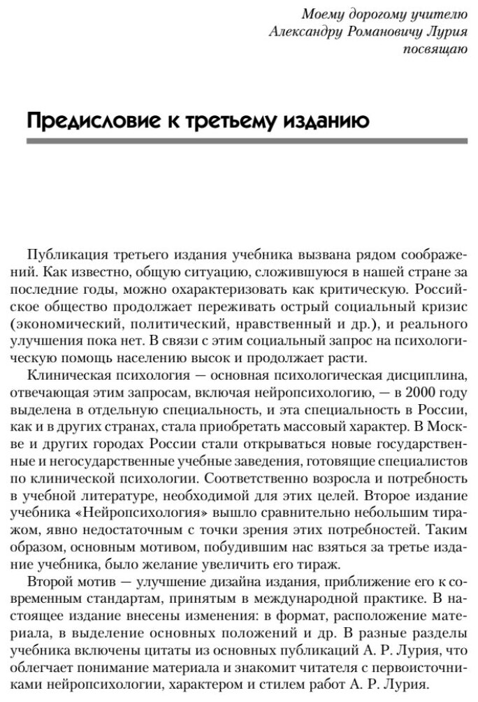 В четвертом, исправленном, издании учебника излагаются основы нейропсихологии - одной из нейронаук, возникшей на стыке психологии и медицины (неврологии, нейрохирургии) и созданной в нашей стране работами А. Р. Лурия и его учеников. В настоящее издание включено более подробное рассмотрение основных тенденций развития современной нейропсихологии, анализ ее многовалентности, широкого спектра теоретических и практических задач, что необходимо для подготовки современных специалистов в области клинической психологии.