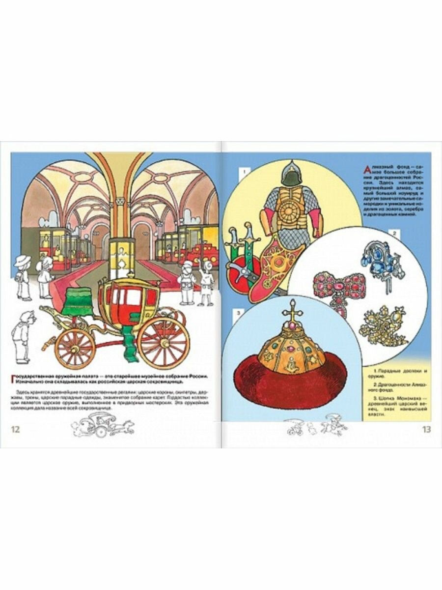 Рассказы сопровождаются иллюстрациями, поэтому ребята с легкостью перенесутся на Красную площадь и осмотрят 20 башен Кремля, увидят самый большой колокол в мире и самую большую древнюю пушку, погуляют по Соборной площади и побывают в Кремлевском дворце, посетят Алмазный фонд и Оружейную палату.