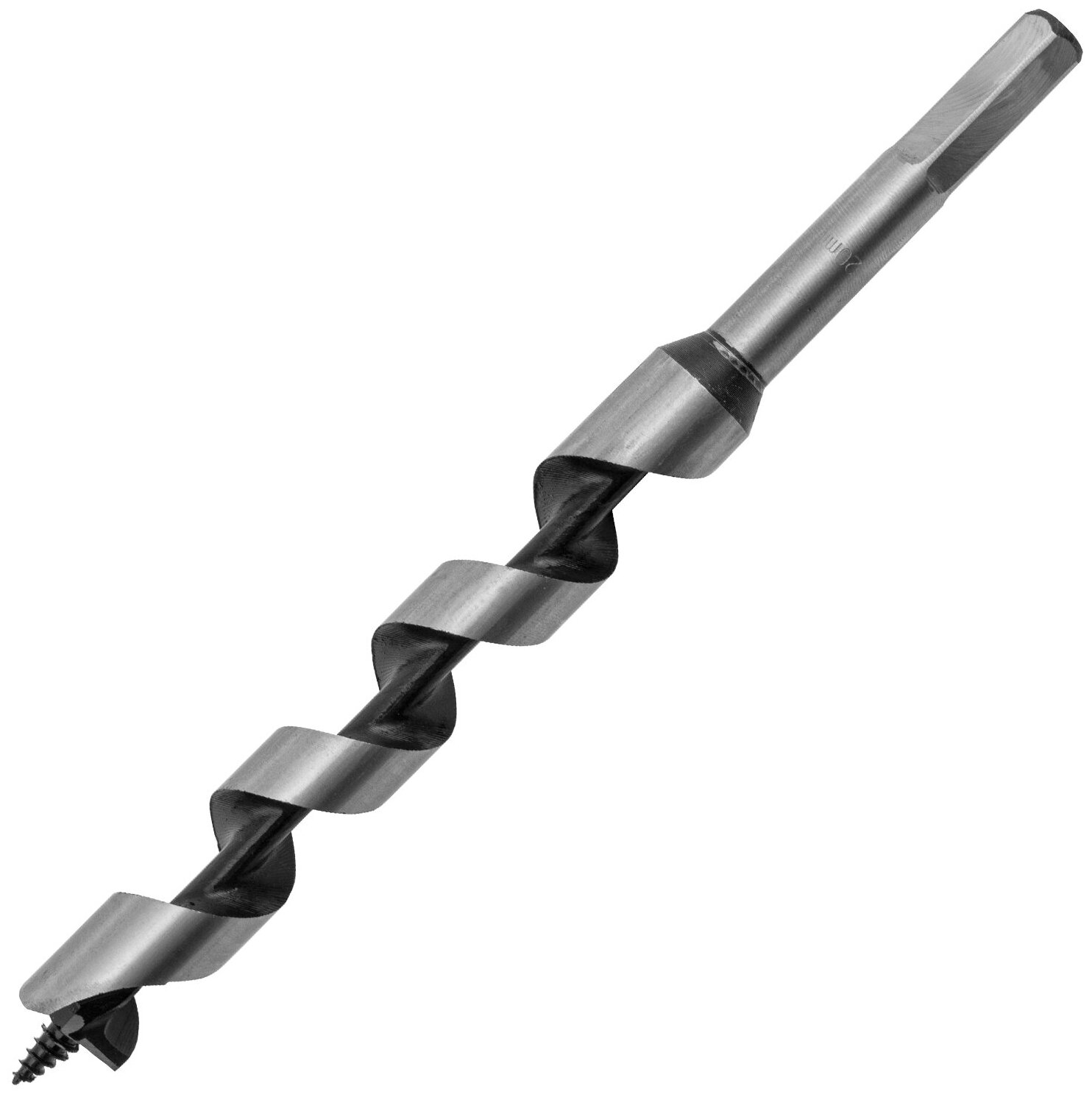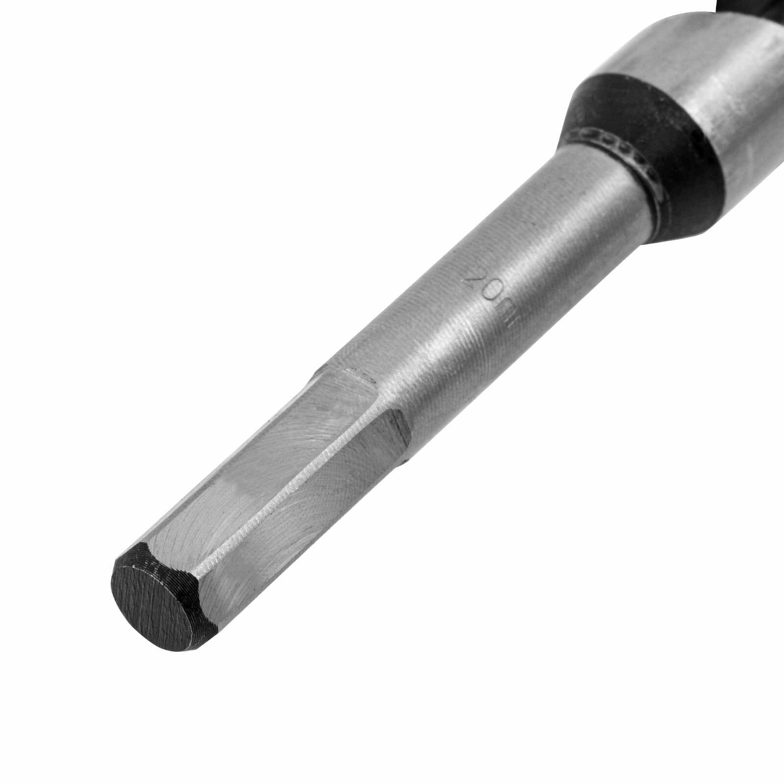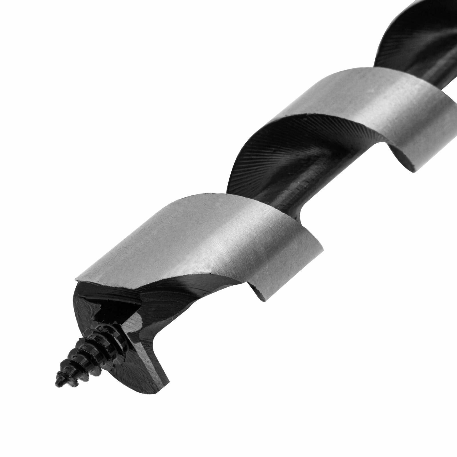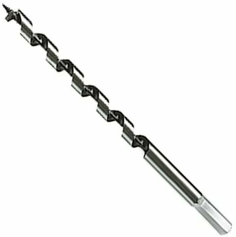 Изготовлено из углеродистой стали с твердостью режущей части 40 HRС. Сверло имеет центрирующее остриё со спиральной нарезкой, уменьшающей осевую нагрузку, и острую подрезную кромку, которая позволяет с высокой точностью просверлить отверстие с гладкими поверхностями, предотвращая смещение сверла и исключая необходимость в предварительном засверливании. Шестигранный хвостовик обеспечивает надежное удержание сверла в патроне.