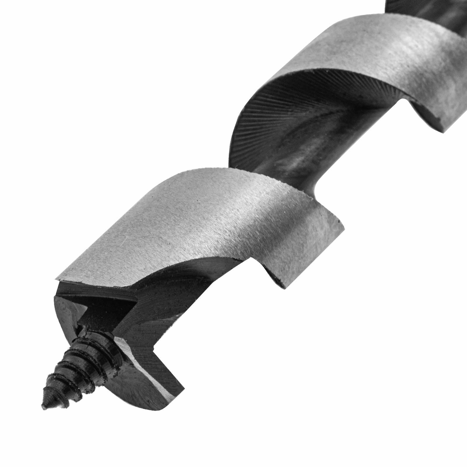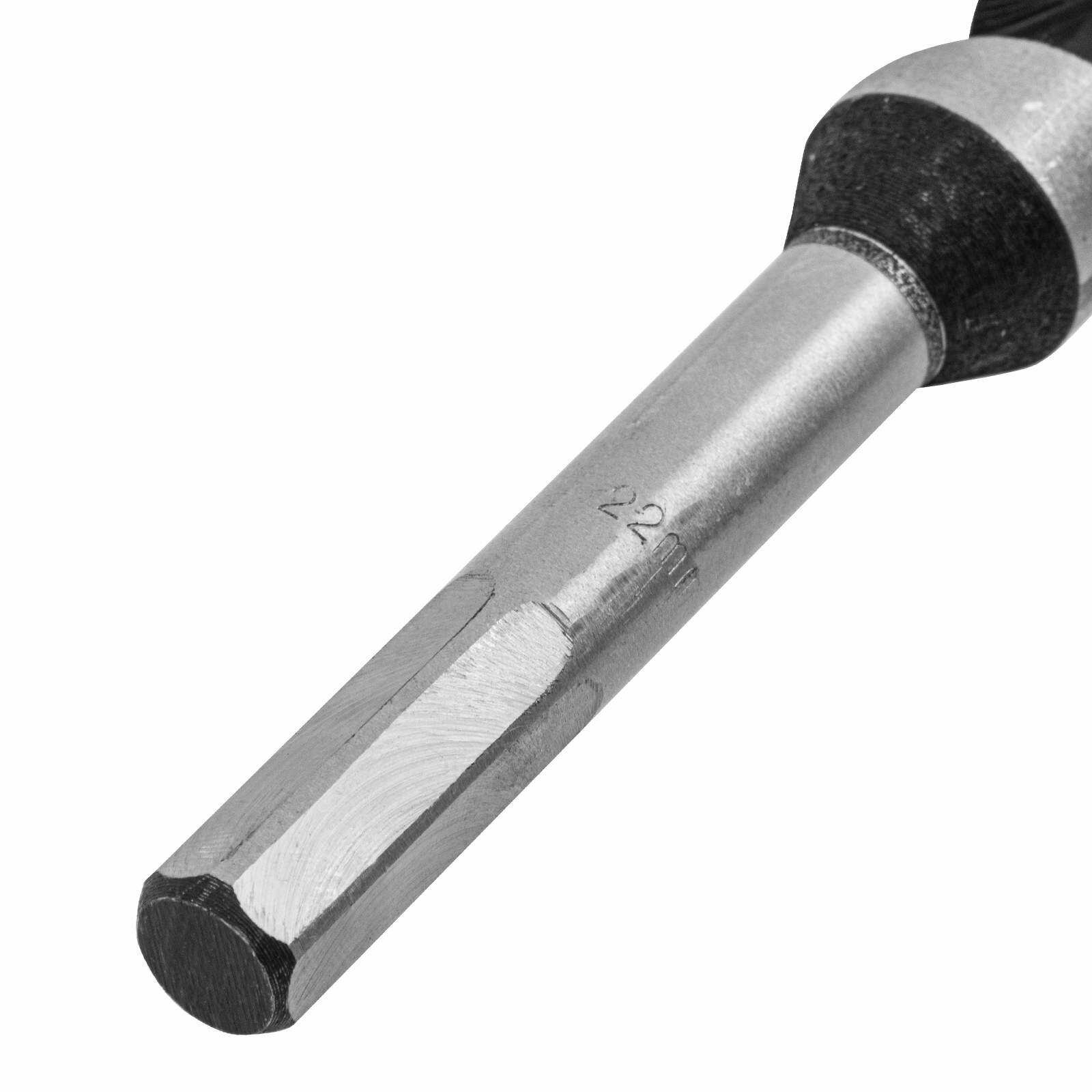 Изготовлено из углеродистой стали с твердостью режущей части 40 HRС. Сверло имеет центрирующее остриё со спиральной нарезкой, уменьшающей осевую нагрузку, и острую подрезную кромку, которая позволяет с высокой точностью просверлить отверстие с гладкими поверхностями, предотвращая смещение сверла и исключая необходимость в предварительном засверливании. Шестигранный хвостовик обеспечивает надежное удержание сверла в патроне.