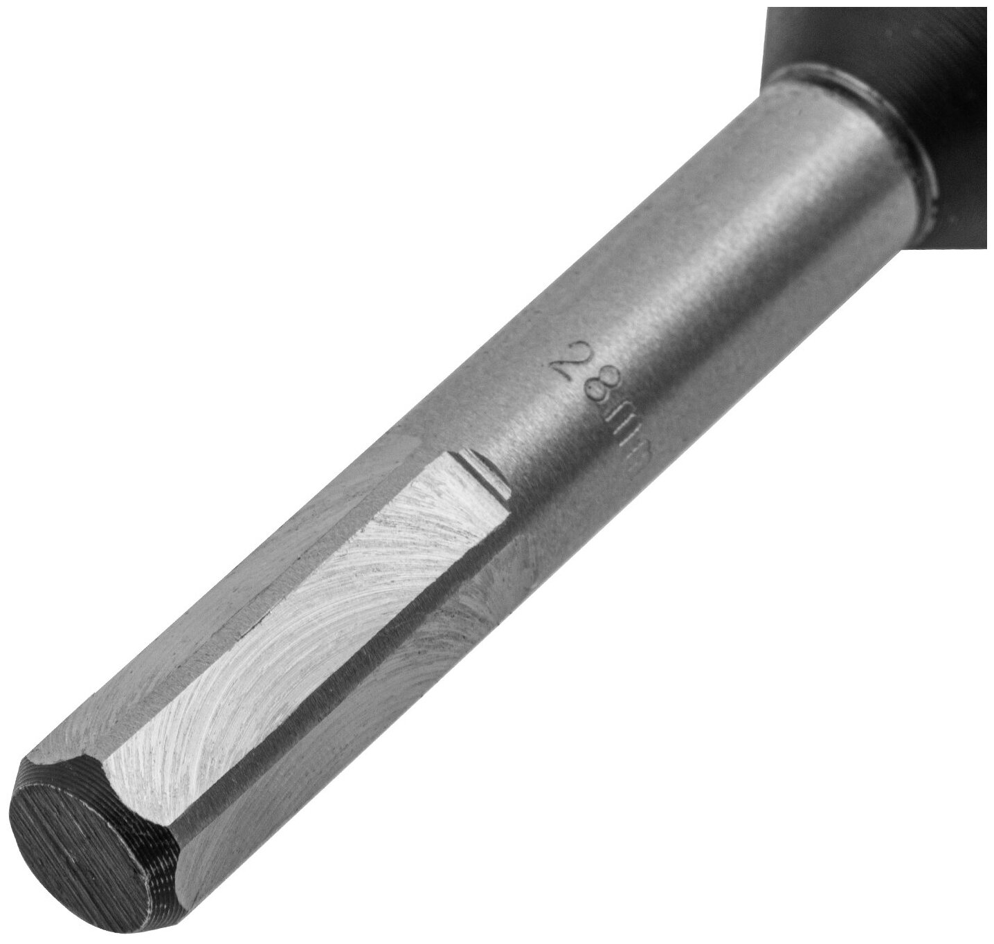 Изготовлено из углеродистой стали с твердостью режущей части 40 HRС. Сверло имеет центрирующее остриё со спиральной нарезкой, уменьшающей осевую нагрузку, и острую подрезную кромку, которая позволяет с высокой точностью просверлить отверстие с гладкими поверхностями, предотвращая смещение сверла и исключая необходимость в предварительном засверливании. Шестигранный хвостовик обеспечивает надежное удержание сверла в патроне.