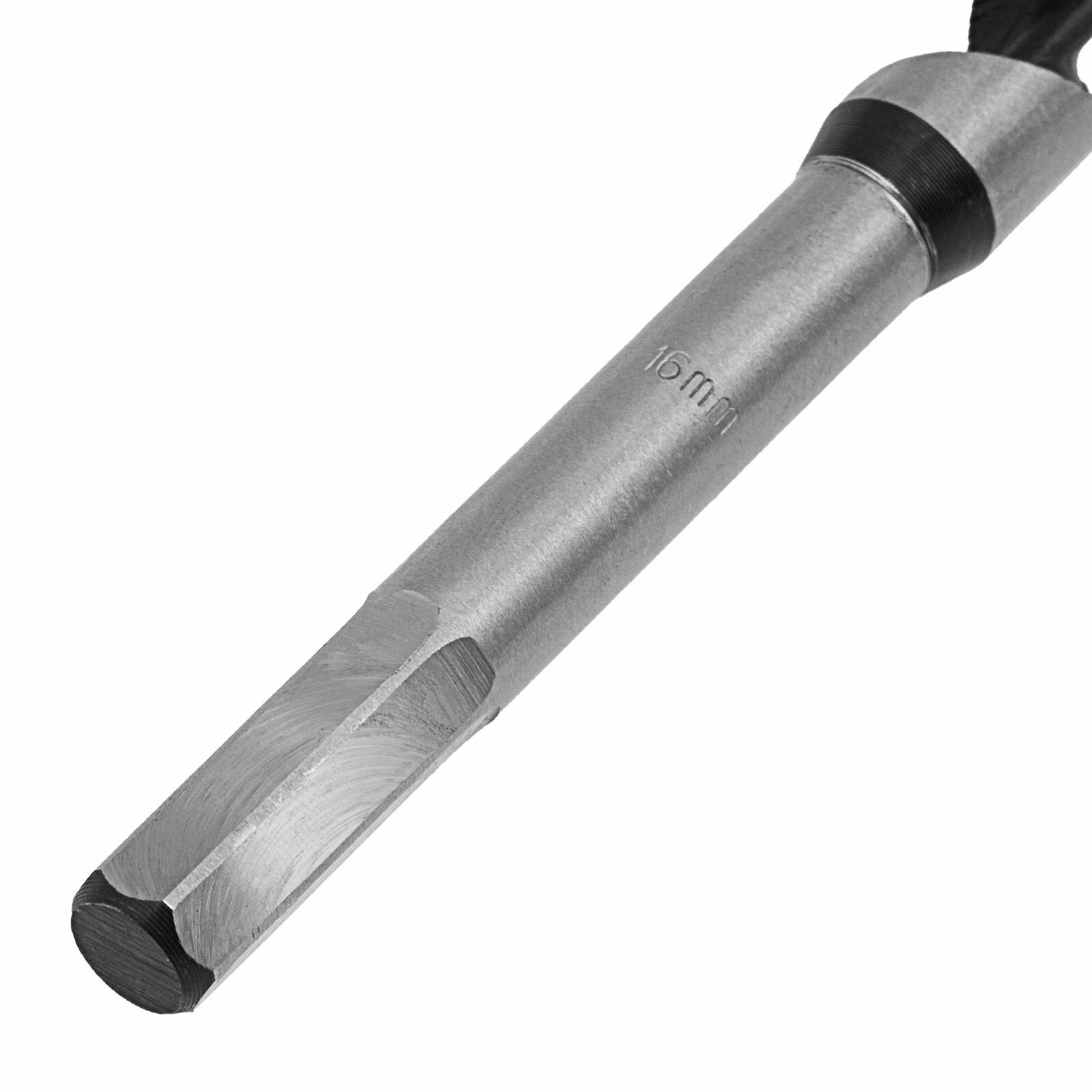 Изготовлено из углеродистой стали с твердостью режущей части 40 HRС. Сверло имеет центрирующее остриё со спиральной нарезкой, уменьшающей осевую нагрузку, и острую подрезную кромку, которая позволяет с высокой точностью просверлить отверстие с гладкими поверхностями, предотвращая смещение сверла и исключая необходимость в предварительном засверливании. Шестигранный хвостовик обеспечивает надежное удержание сверла в патроне.
