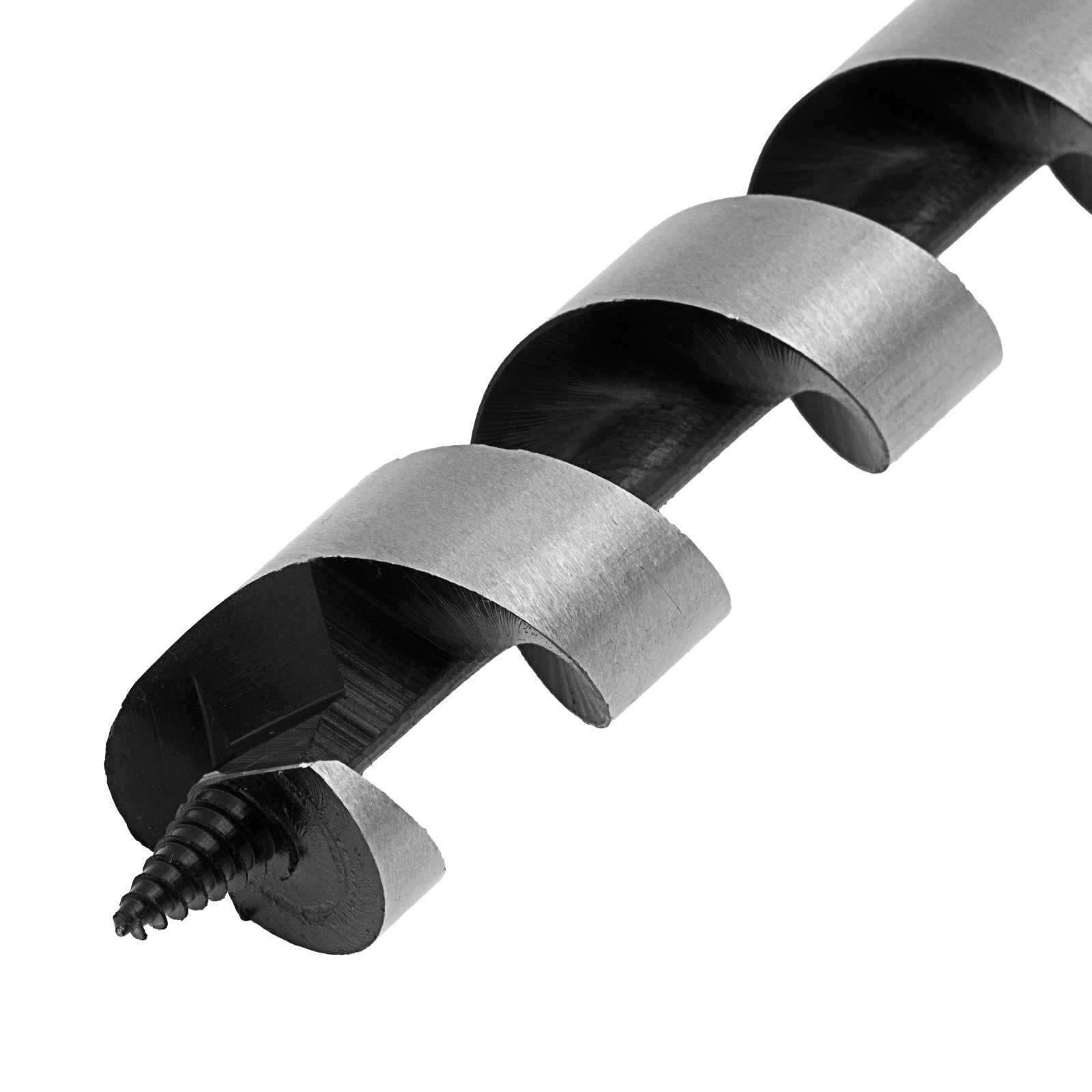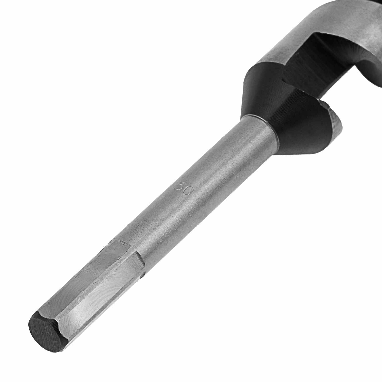 Изготовлено из углеродистой стали с твердостью режущей части 40 HRС. Сверло имеет центрирующее остриё со спиральной нарезкой, уменьшающей осевую нагрузку, и острую подрезную кромку, которая позволяет с высокой точностью просверлить отверстие с гладкими поверхностями, предотвращая смещение сверла и исключая необходимость в предварительном засверливании. Шестигранный хвостовик обеспечивает надежное удержание сверла в патроне.