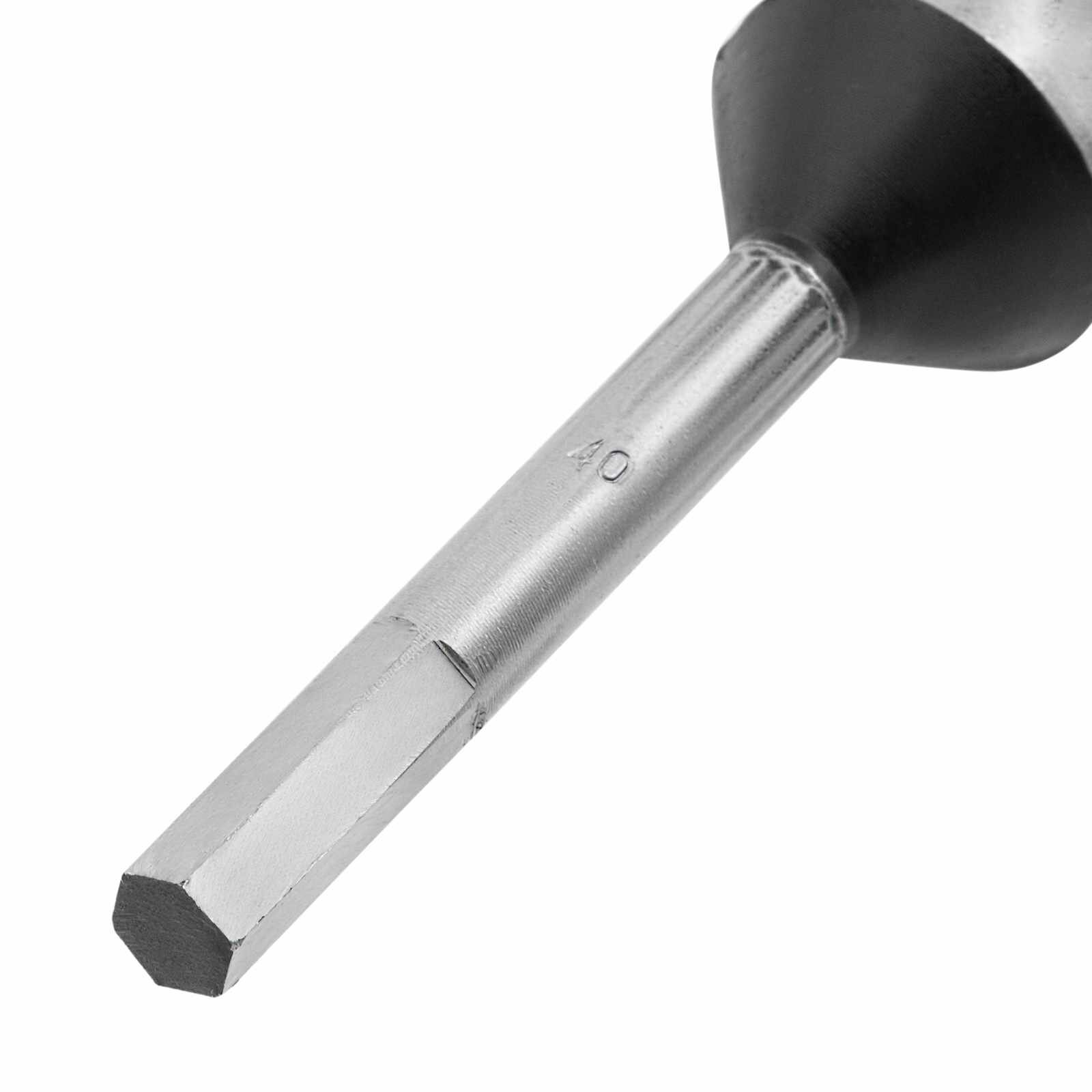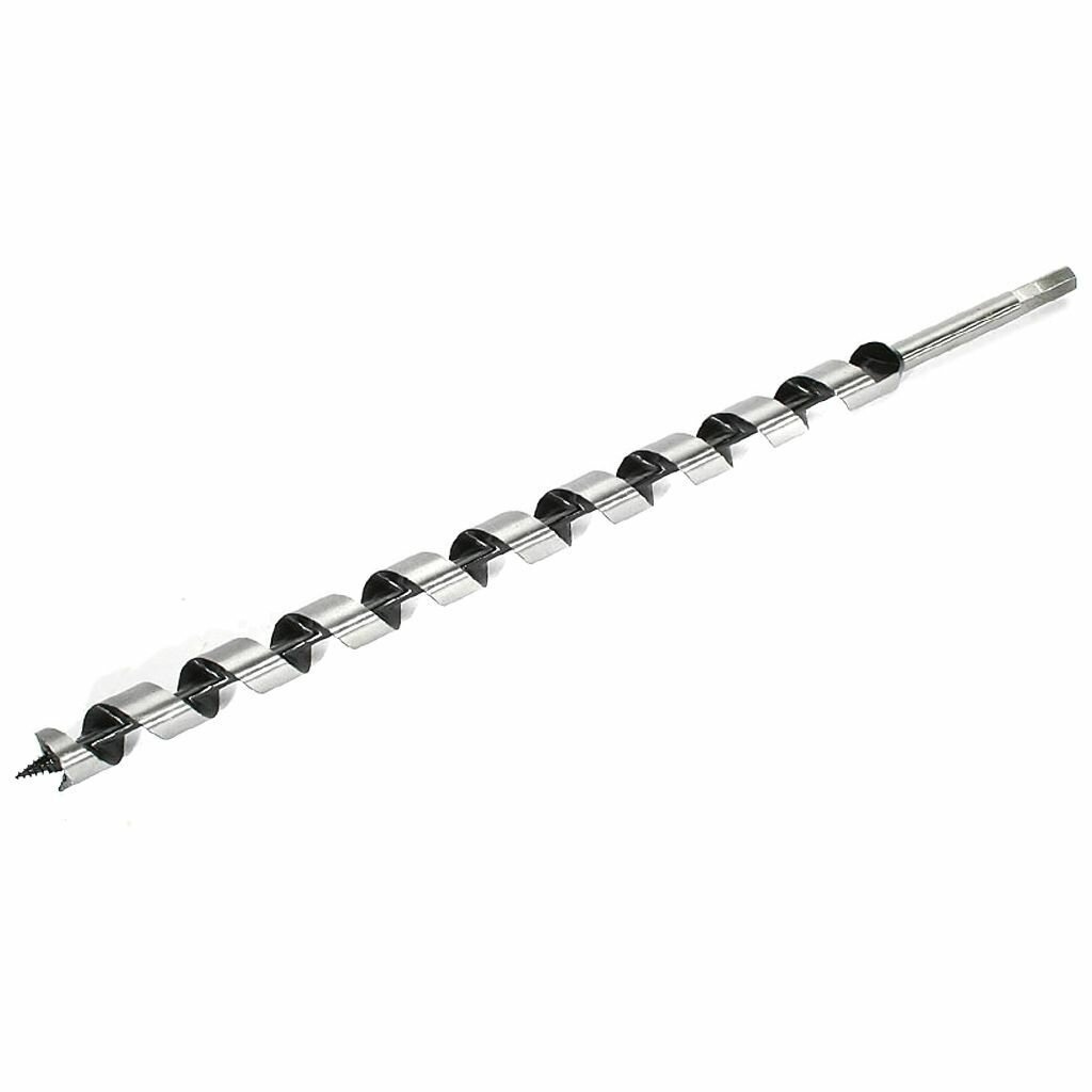 Изготовлено из углеродистой стали с твердостью режущей части 40 HRС. Сверло имеет центрирующее остриё со спиральной нарезкой, уменьшающей осевую нагрузку, и острую подрезную кромку, которая позволяет с высокой точностью просверлить отверстие с гладкими поверхностями, предотвращая смещение сверла и исключая необходимость в предварительном засверливании. Шестигранный хвостовик обеспечивает надежное удержание сверла в патроне.