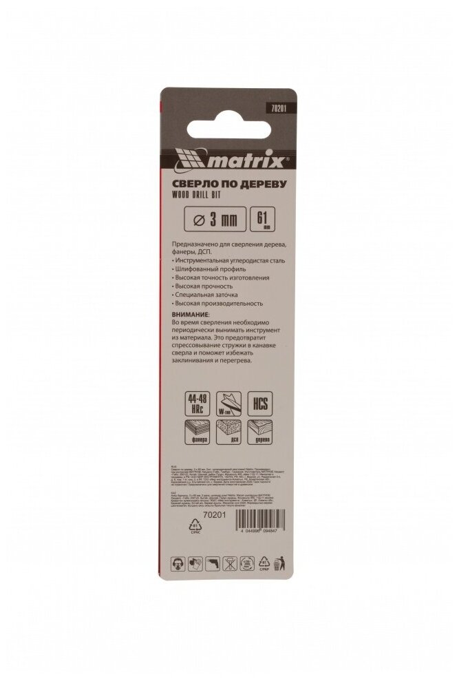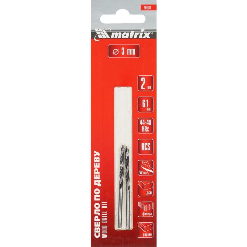 Сверло по дереву Matrix размером 3 х 61 мм, с цилиндрическим хвостовиком, 2 шт. в упаковке, предназначено для получения небольших по диаметру отверстий в древесине. Особая конструкция обеспечивает эффективный отвод стружки и получение точного и ровного отверстия. Оснастка пригодится при проведении строительных, ремонтных и отделочных работ.ПреимуществаНадежность и долговечность - при изготовлении использована прочная инструментальная сталь.Высокий ресурс - сверло закалено до твердости 44-48 HRC и выдерживает интенсивное использование.Точность выполняемых работ - сверло заточено на автоматическом оборудовании, отполированная поверхность позволяет получать идеально ровные отверстия.Удобное использование - центральный шип предотвращает смещение оснастки, поэтому предварительное засверливание не требуется.