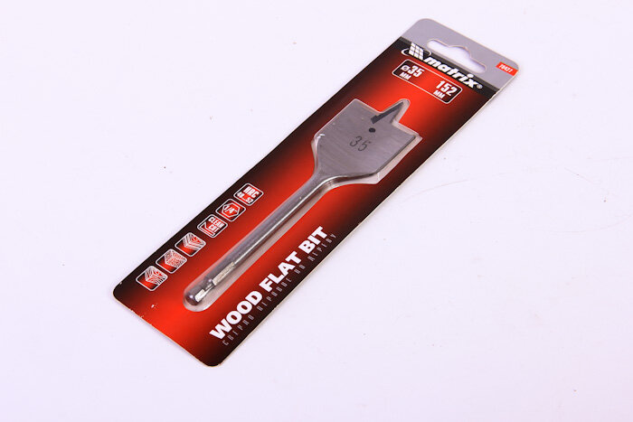 Диаметр получаемого отверстия: 35 мм Сверло перовое изготовлено из углеродистой стали. Твердость режущих кромок 45–54 HRС. Может использоваться с ручной механической и электрической дрелями, а также сверлильными станками. Имеет плечевое заострение. Хвостовик шестигранной формы предотвращает проворот сверла в патроне. Сверло перовое предназначено для получения отверстий в мягкой и твердой древесине с любым расположением волокон, клееной фанере, ДСП.