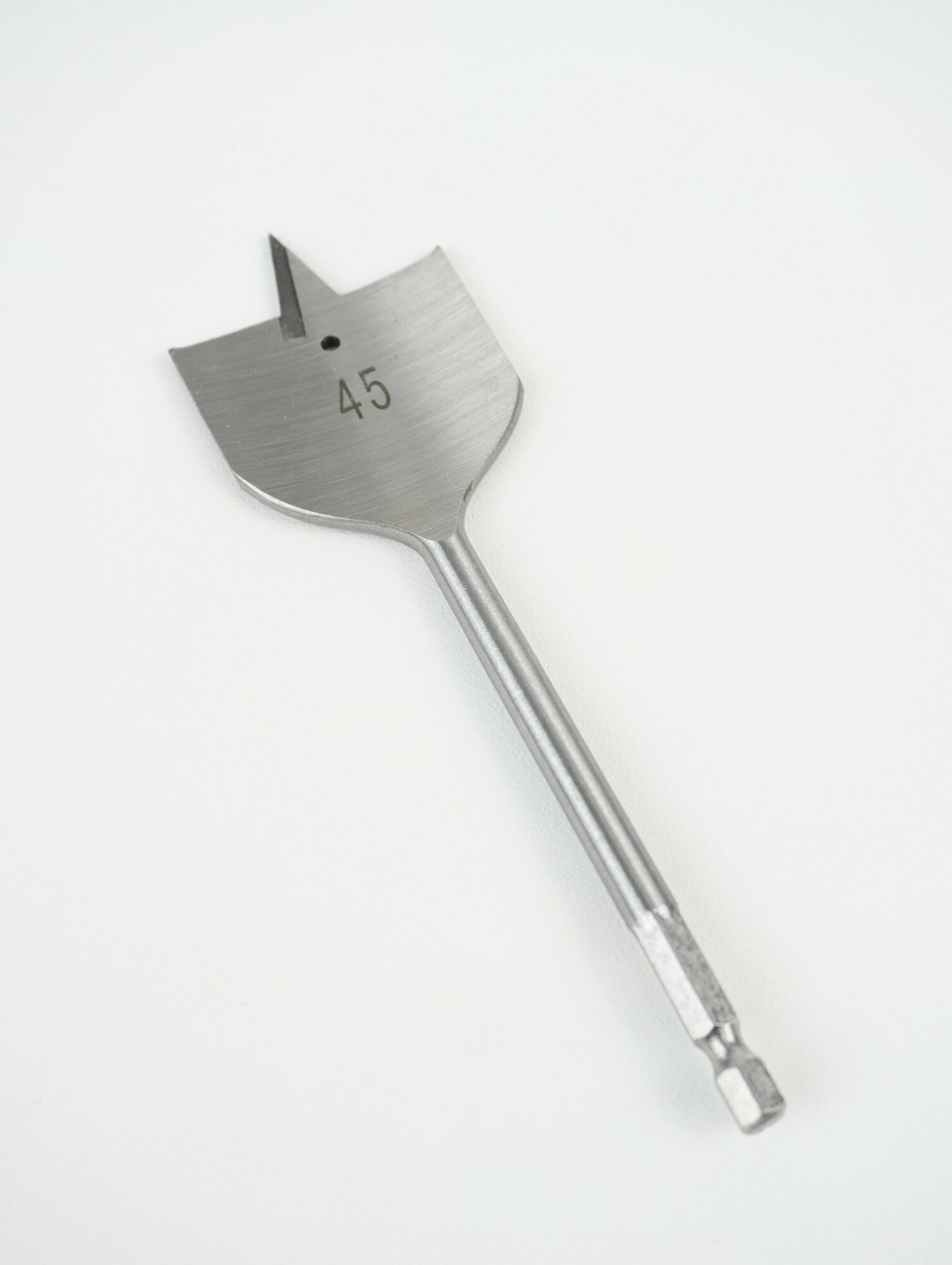 Диаметр получаемого отверстия: 45 мм Сверло перовое изготовлено из углеродистой стали. Твердость режущих кромок 45–54 HRС. Может использоваться с ручной механической и электрической дрелями, а также сверлильными станками. Имеет плечевое заострение. Хвостовик шестигранной формы предотвращает проворот сверла в патроне. Сверло перовое предназначено для получения отверстий в мягкой и твердой древесине с любым расположением волокон, клееной фанере, ДСП.