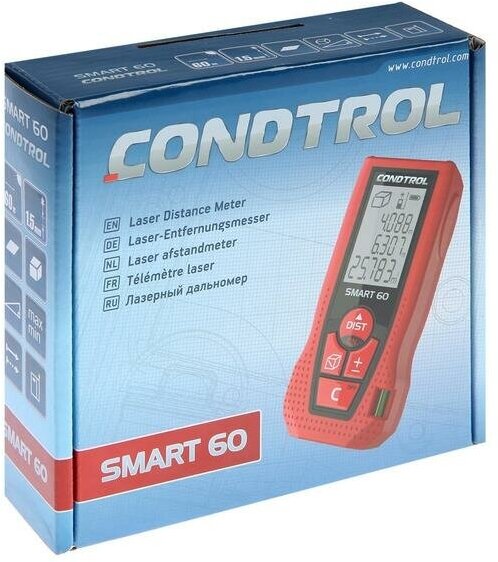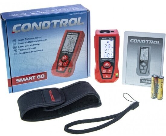 Измеряет растояние как в помещении, так и на улице на расстоянии до 60 метров с погрешностью не более ±1,5 мм. Дальномер обладает ударопрочным корпусом с резиновым уплотнением. Функционал дальномера CONDTROL SMART 60 включает в себя автоматический расчет площади и объёма, выполнение сложения, вычитания, имеет функцию непрерывного измерения (трекинг). Для проведения замеров в труднодоступных местах дальномер оснащён режимом «косвенного» измерения по теореме Пифагора.