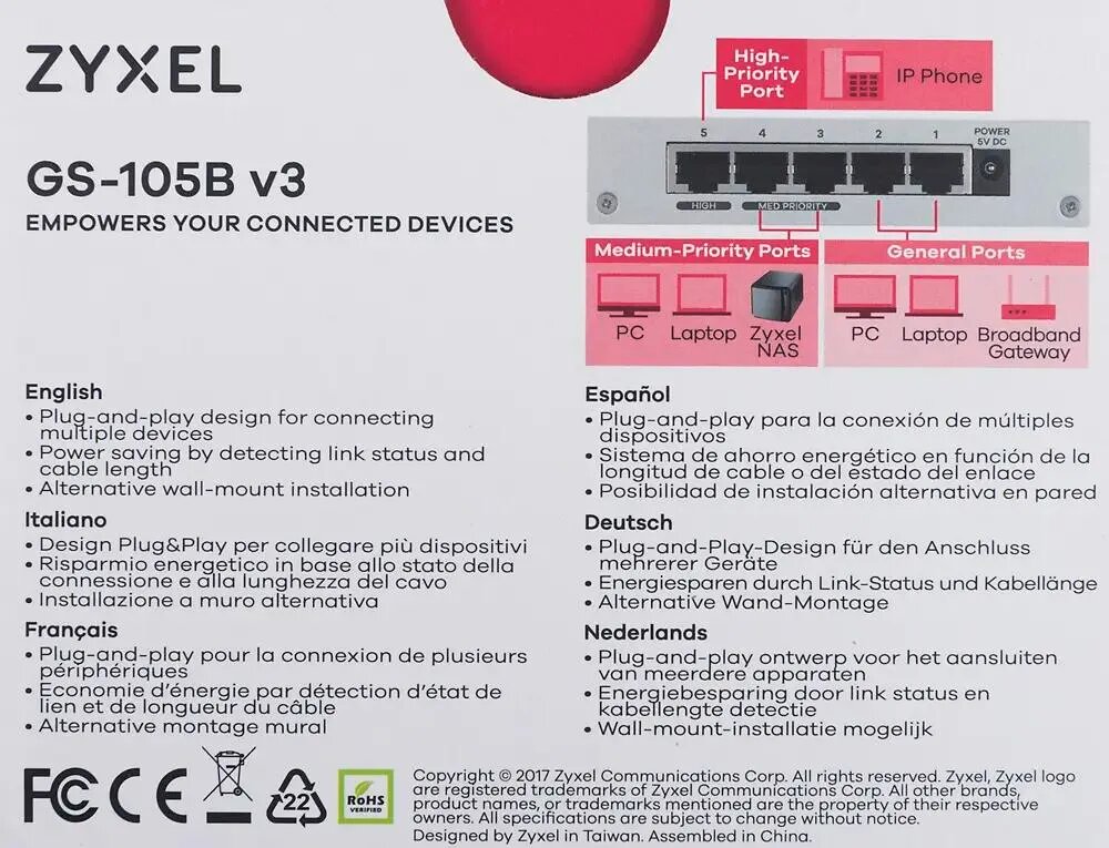 Zyxel GS-105B v3 — это 5-портовый настольный коммутатор Gigabit Ethernet, обеспечивающий гигабитные скорости для подключенных к домашней сети устройств. Новая конструкция с портами QoS гарантирует стабильное качество работы таких интенсивно использующих полосу пропускания приложений, как VoIP и обмен данными. Преимущества Компактный прочный корпус, который можно установить не только на столе, но и на стене GS-105B v3 прекрасно впишется в интерьер любой комнаты.