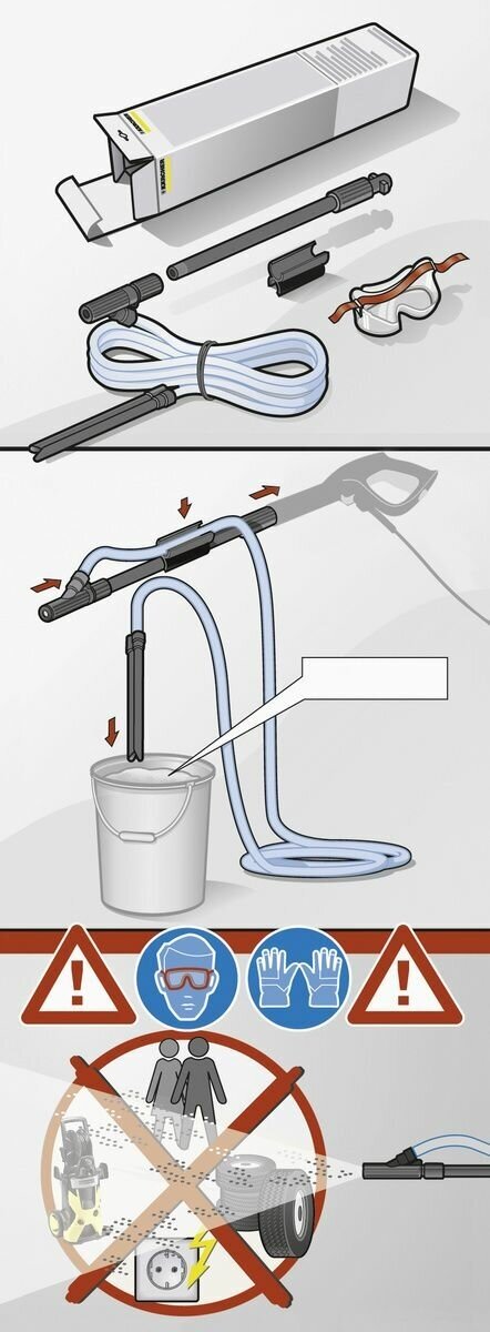 **Комплект для струйной абразивной очистки Karcher** для удаления ржавчины, старой краски и стойких загрязнений с использованием абразивного средства Kärcher. Подходит ко всем бытовым аппаратам высокого давления Kärcher классов K 2 – K 7.