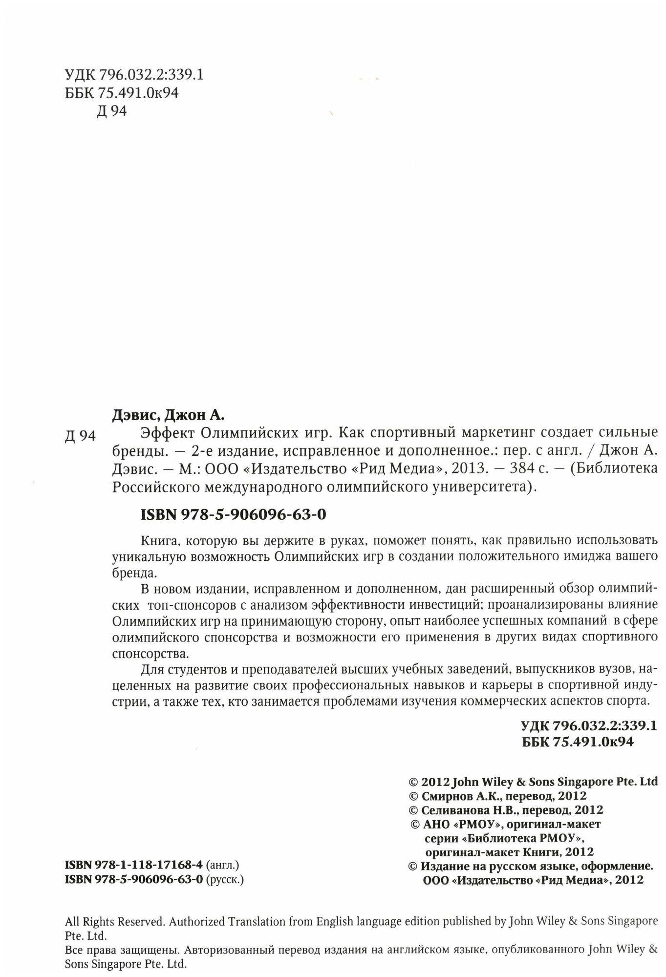 , которую вы держите в руках, поможет понять, как правильно использовать уникальную возможность Олимпийских игр в создании положительного имиджа вашего бренда. В новом издании, исправленном и дополненном, дан расширенный обзор олимпийских топ-спонсоров с анализом эффективности инвестиций; проанализированы влияние Олимпийских игр на принимающую сторону, опыт наиболее успешных компаний в сфере олимпийского спонсорства и возможности его применения в других видах спортивного спонсорства.