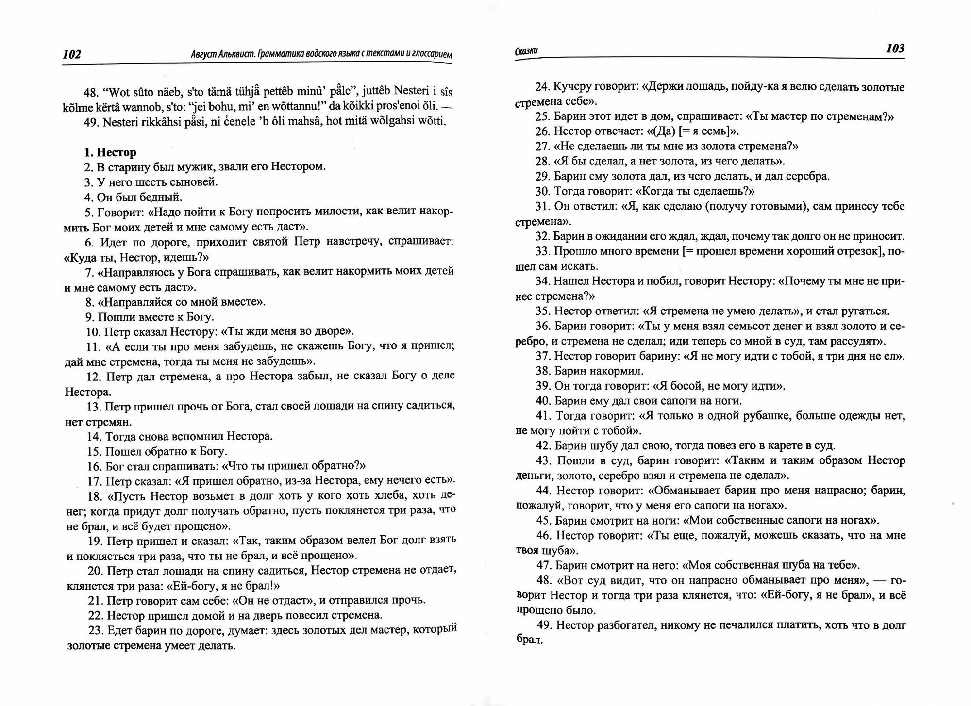 В книгу вошел перевод со шведского языка первой водской грамматики "Wotisk grammatik jemte sprakprofoch ordforteckning", изданной в Хельсинки в 1856 г., автор которой - действительный член Петербургской академии наук Август Альквист; а также написанная по-русски в 1922 г. "Первая грамматика Вольского языка" носителя водского языка Д. Цветкова, не знавшего о существовании труда своего предшественника. Обе грамматики публикуются с комментариями. Водские тексты, записанные А. Альквистом и приложенные к его грамматическому описанию, переведены на русский язык и оттлоссированы.