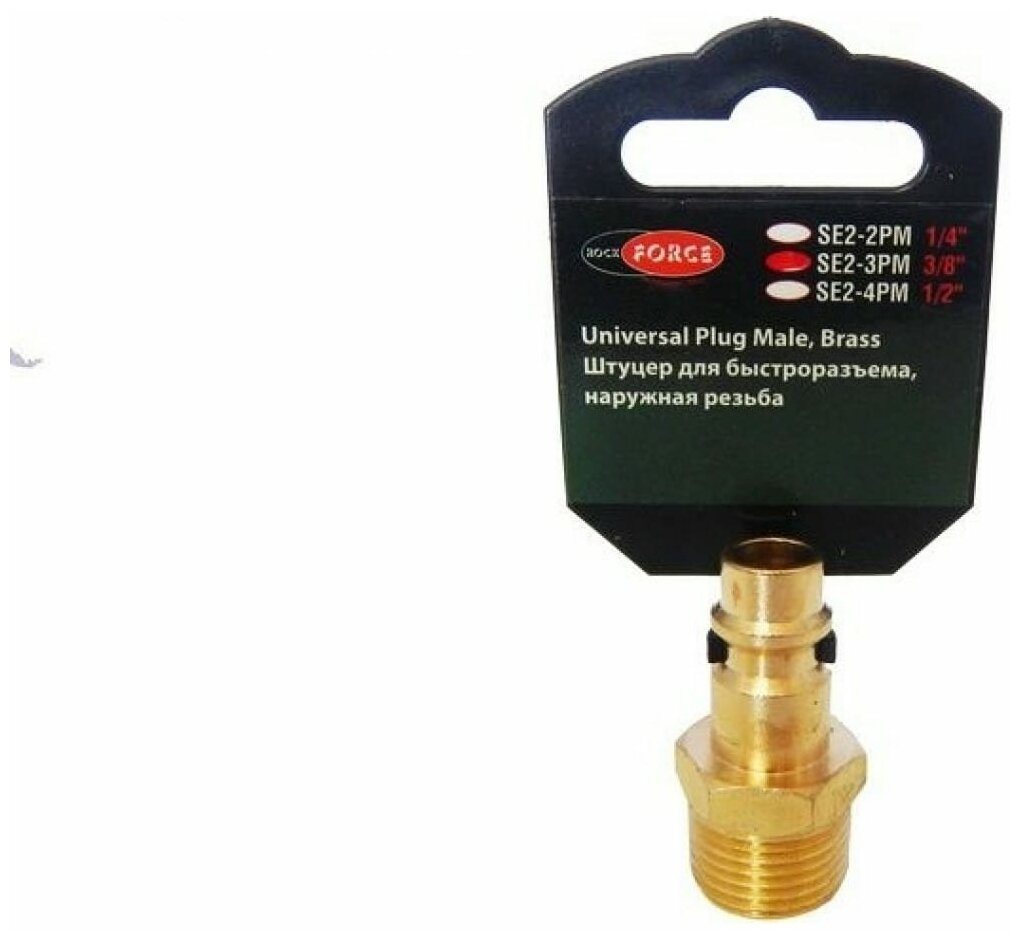 Штуцер для быстроразъема 3/8"M в пластиковом держателе ROCKFORCE применяется для соединения различных частей пневмосистем. С одной стороны штуцер имеет наружную резьбу 3/8", с другой быстросъемное соединение — рапид папа. Созданная конструкция обладает высокой надежностью и герметичностью.