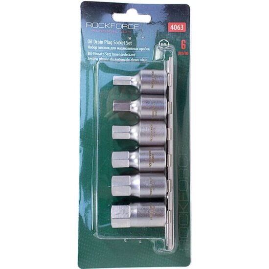 Набор головок 1/2DR шестигранных для маслосливных пробок 6 предметов ROCKFORCE позволяют слить отработанное масло с двигателей легковых автомобилей. Комплект подойдет для автомеханика.