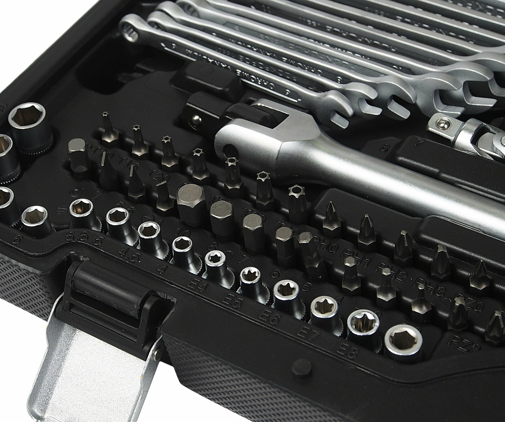 | Комплектация | головки удлиненные, свечная головка, ключи комбинированные, ключи накидные, ключи многогранные, отвертка короткая, отвертки (насадки), биты (вставки), молоток, плоскогубцы, струбцины, трещотка, кардан шарнирный, удлинитель, вороток |