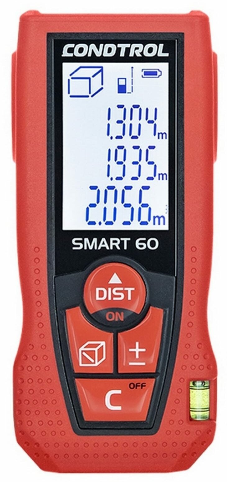 CONDTROL лазерный дальномер, выполненный в эргономичном ударопрочном корпусе. Лазерная рулетка уверенно работает на расстоянии от 0,05 до 60 метров даже на улице. CONDTROL отличается высокой скоростью измерений, что позволяет быстро проводить необходимое количество расчетов. Погрешность измерения всего 1,5 мм. CONDTROL автоматически рассчитывает площадь и объём, выполняет сложение, вычитание, имеет функцию непрерывного измерения (трекинг). Для проведения замеров в труднодоступных местах дальномер оснащён режимом косвенного измерения по теореме Пифагора. Во время замера расстояния между вертикальными конструкциями (стены, оконные и дверные проемы, колонны) лазерный луч должен располагаться строго горизонтально относительно поверхности измерения. Несоблюдение этого условия ведёт к увеличению погрешности. Пузырьковый уровень, которым оснащён CONDTROL , позволяет легко контролировать горизонтальное положение лазерной рулетки, благодаря чему можно получить максимально точные результаты. CONDTROL оснащён большим инверсионным дисплеем. Крупные цифры и символы на экране создают комфортные условия для работы даже в условиях плохого освещения. Комплектация: дальномер, сумка-чехол, ремешок, источники питания, руководство пользователя.