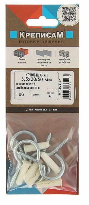 Сервис сравнения цен СкидкаГИД предлагает сравнить цены на товар «Крюк-шуруп 35x30/50 мм с дюбелем MULTI Plug 6x25 мм 6 шт Европартнер»