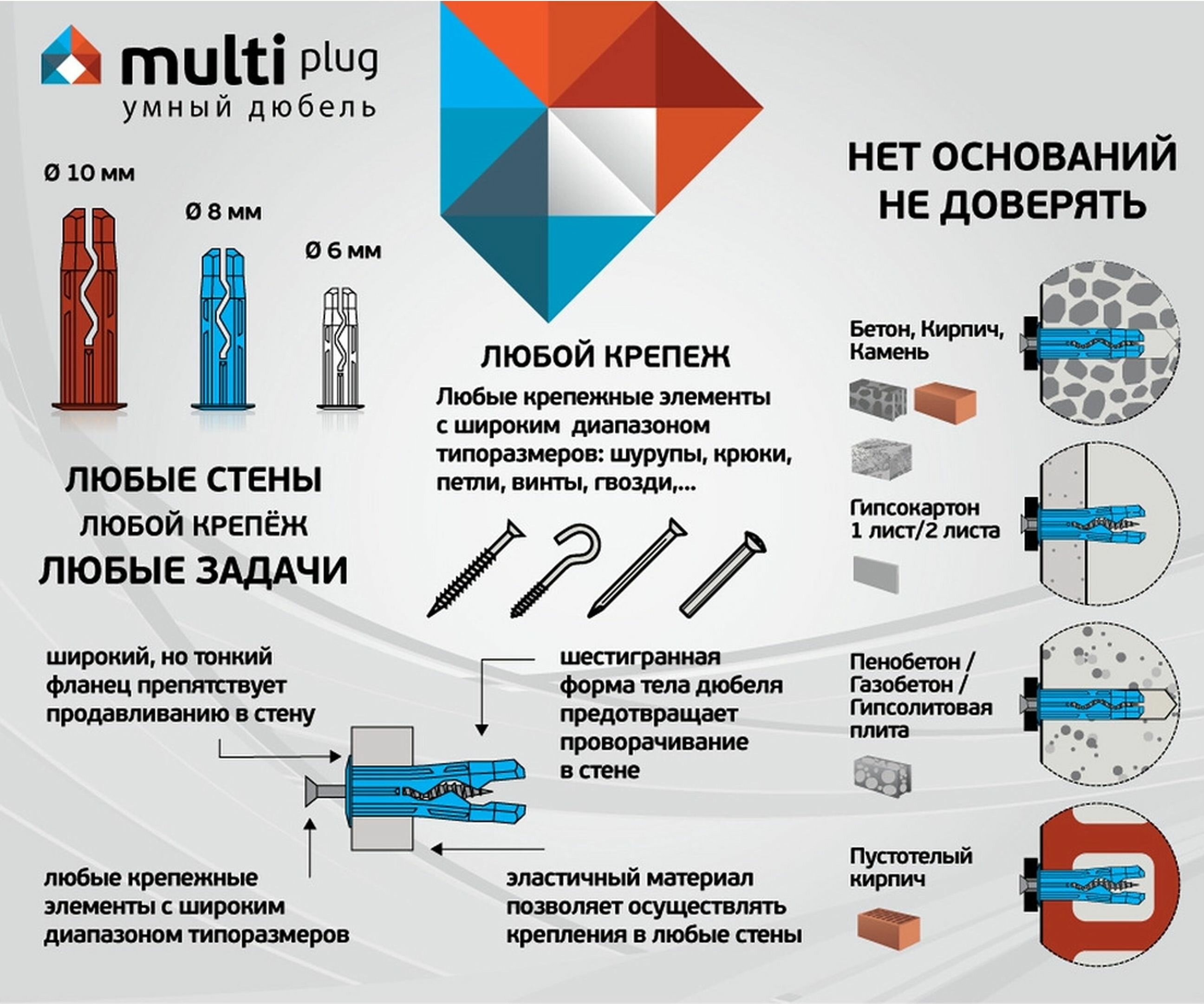Дюбель multi plug для наружных и внутренних работ предназначен для крепления в любые основания любыми крепежными элементами. Материал дюбеля - нейлон, устойчив к воздействию химических веществ и влаги. Диапазон температур: от -40 до +80 град. Цельсия.