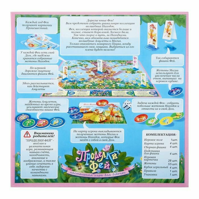"Проделки фей" - весёлая и увлекательная игра, развивающая навыки счёта, находчивость, внимание и воображение, а также умение сочетать в себе лидерские качества с командными навыками. В игре могут принимать участие от 1 до 4 человек. Длительность игры - 30-45 минут.