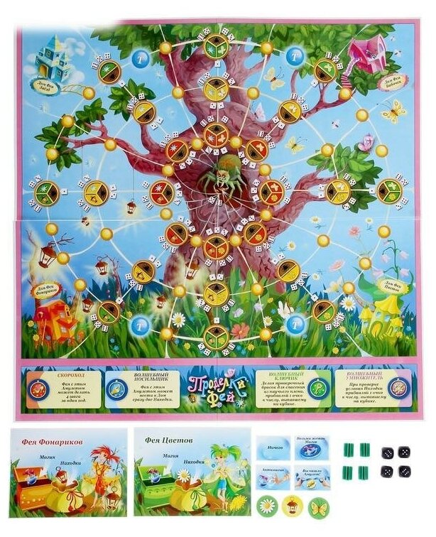 Настольная игра представлена красочно исполненным игровым полем, фишками волшебниц-фей на подставках, игровыми карточками и жетонами. Задача фей вызвать собрать самую большую коллекцию находок, чтобы стать королевой бала. Для перемещения по игровому полю участники используют фишки на подставке, количество ходов определяет игральный кубик. Передвигаясь по дорожке, феи выполняют задания, остерегаясь паука. Таблица происшествий подскажет, какое задание необходимо выполнить на данном этапе.
