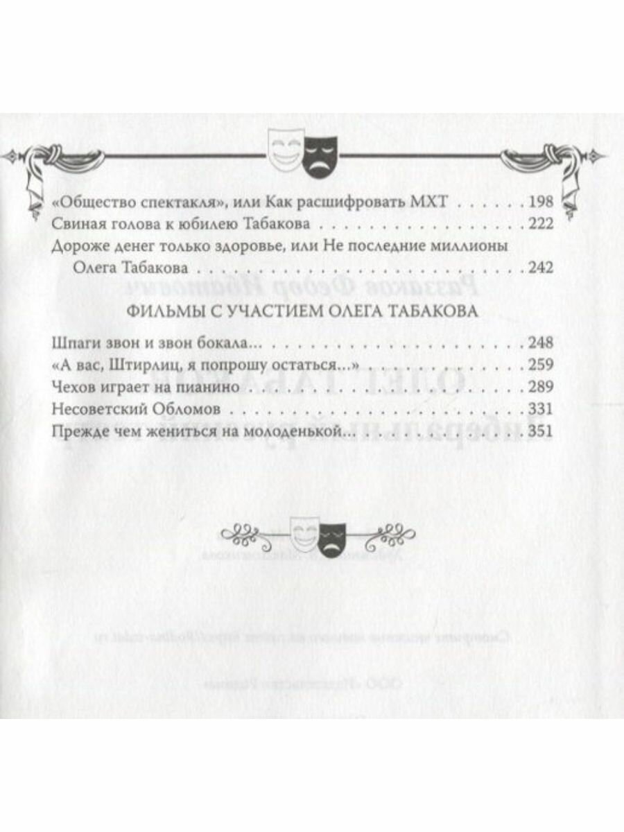 Народный актер, любимый педагог, известный режиссер, театральный и общественный деятель Олег Табаков - фигура, о которой интересно поговорить. Про него хочется знать больше. О счастливом детстве в Саратове. О первых годах в Москве. О том, легендарном, "Современнике". О "Табакерке" и о МХТ им. А. П. Чехова. О кино. И конечно же, о поездках, о встречах, о расставаниях. . В книге Федора Раззакова изложены факты, приведены детали, забавные истории, тонкости взаимоотношений, разные точки зрения - рассказано всё без купюр. Выводы пусть делает читатель.