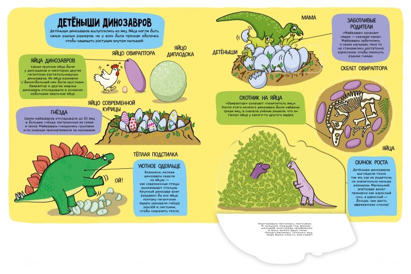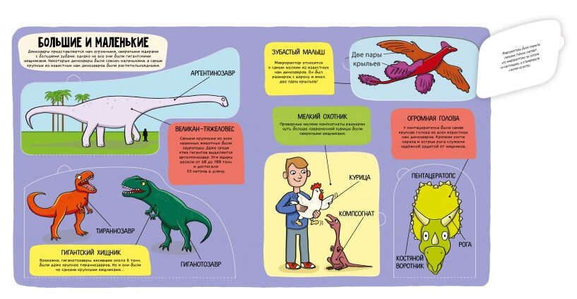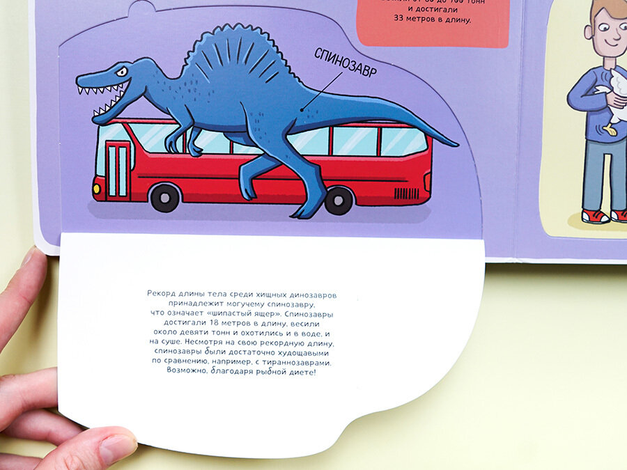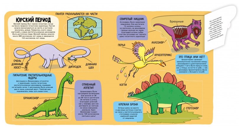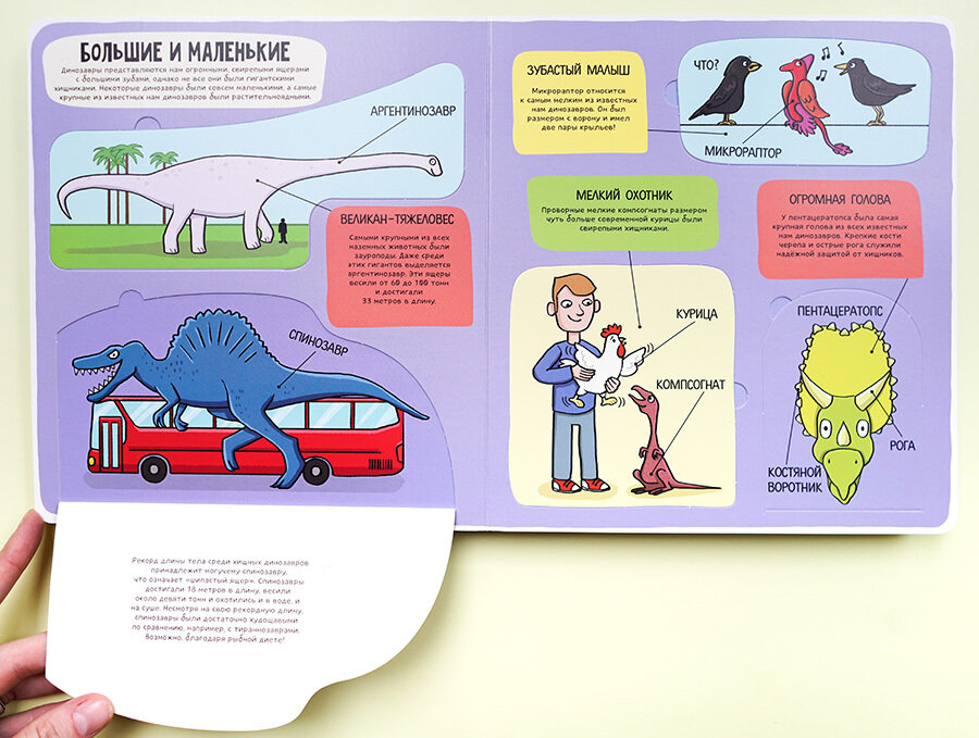 после первого же открытия окошек, плотно на место они уже не ложатся - сразу происходит залом (но эо относится к большинству книг с окошками) - зато они привлекают дополнительный интерес ребенка и ассоциация, что окошко открылось помогает запомнить информацию. Сами страницы плотные, картонные. Динозавры красочные на спокойном цветном фоне, а текст (черными буквами выделен более темным фоном) не перегружен информацией, кроме огромного количества мудреных и порой еле выговариваемых названий динозавров