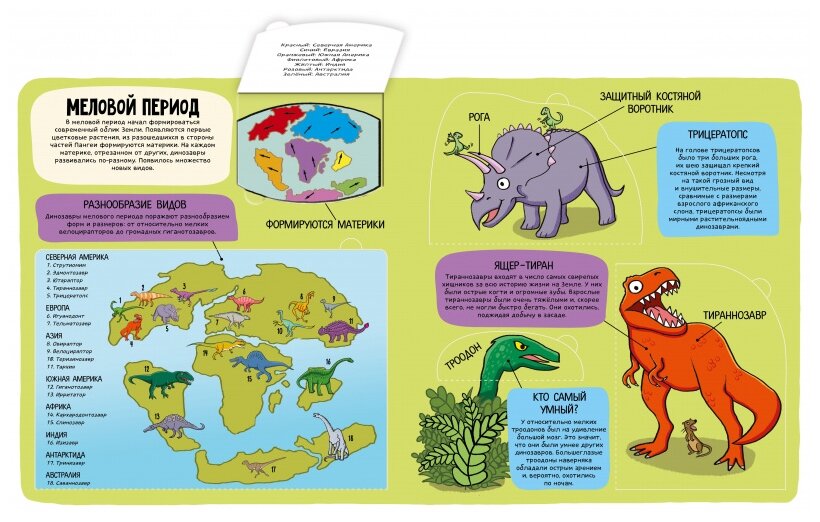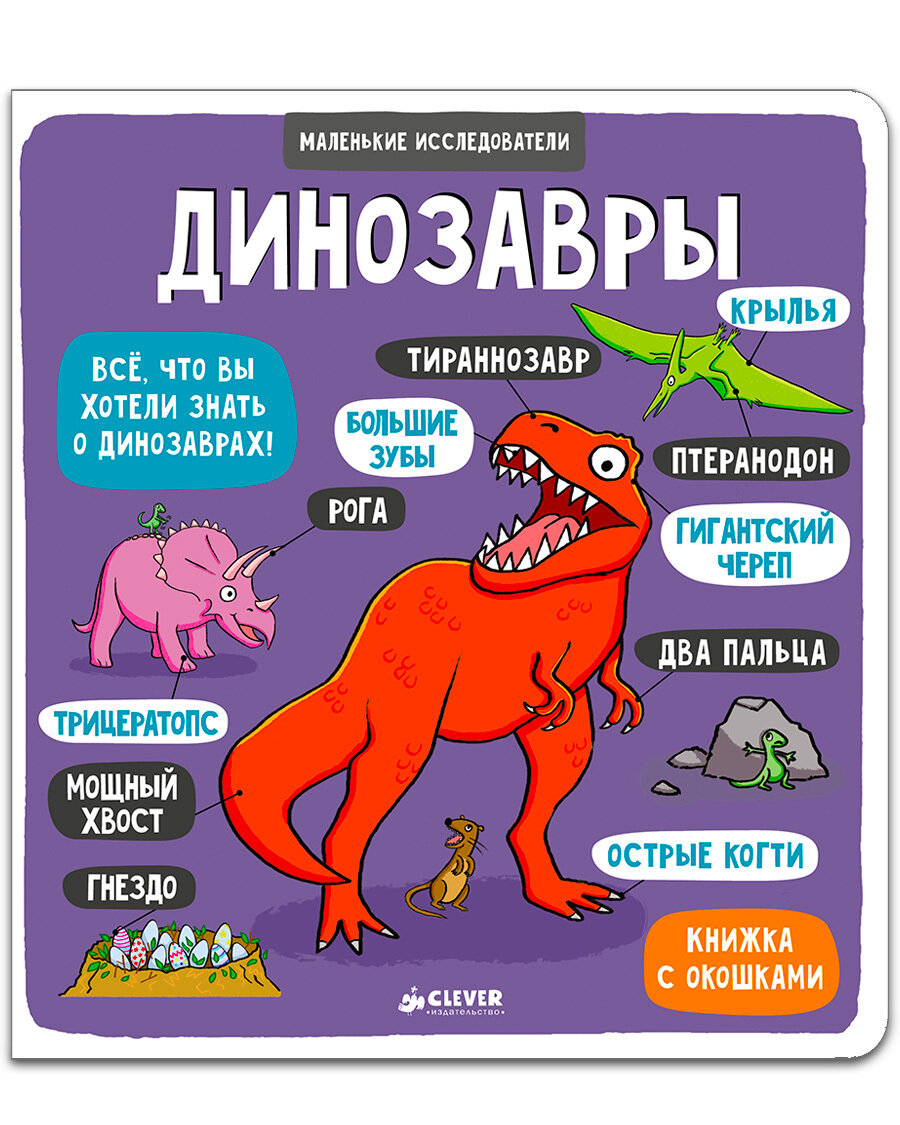 Красочная энциклопедия с маленькими окошками «Динозавры» познакомит ребенка с разными животными, жившими во времена динозавров. На каждом развороте книги — яркие иллюстрации и очень понятный рассказ о том, какие виды динозавров жили в разные эпохи. Открывайте окошки, чтобы узнать еще больше о жизни доисторических ящеров.