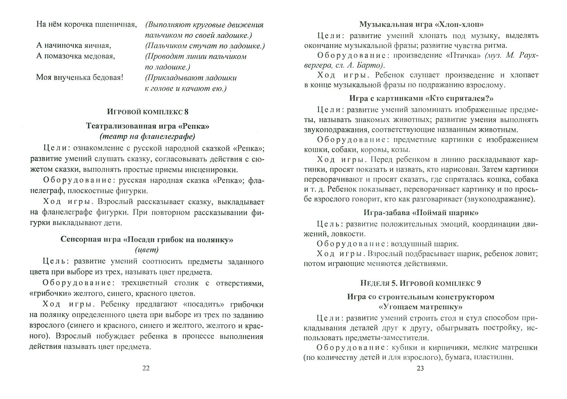 В пособии представлены игровые комплексы (48) для детей 2-3 лет, состоящие из увлекательных для малышей игр и игровых заданий, направленных на то, чтобы научить их общаться, уверенно двигаться, активно говорить, рисовать, играть, лепить, понимать и инсценировать веселые сказки; обогатить представления об окружающем мире и наполнить их жизнь положительными эмоциями. Все игровые комплексы могут проводиться как индивидуально с малышом, так и с группой детей. Сфера их применения широка: они могут быть эффективно использованы в Центрах игровой поддержки ребенка раннего возраста, центрах раннего развития, в деятельности групп ДОО, в системе ранней помощи детям раннего возраста с ОВЗ и их семьям, а также в процессе семейного воспитания.