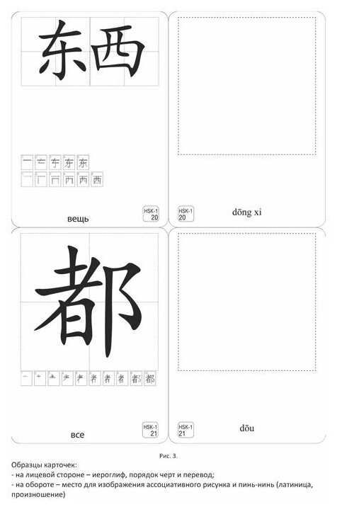 1. На одной стороне карточки размещены непосредственно иероглиф, порядок черт при его написании и перевод на русский язык (в нижней части карточки). Специальный футляр, закрывающий перевод иероглифа, предназначен для самоконтроля при распознавании иероглифа.