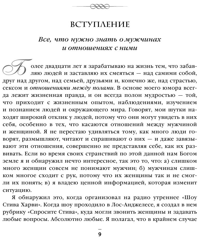 В этой книге Стив Харви дает прекрасную возможность понять ход мыслей представителей сильного пола, раскладывая по полочкам множество проблем: Почему ваш мужчина до сих пор не сделал вам предложение? Какие пять вопросов нужно задать, чтобы определить серьезность его намерений? Что вы должны, а что не можете требовать от мужчины? Как распознать маменькиного сыночка, и что делать в этом случае? Когда знакомить кавалера со своими детьми?