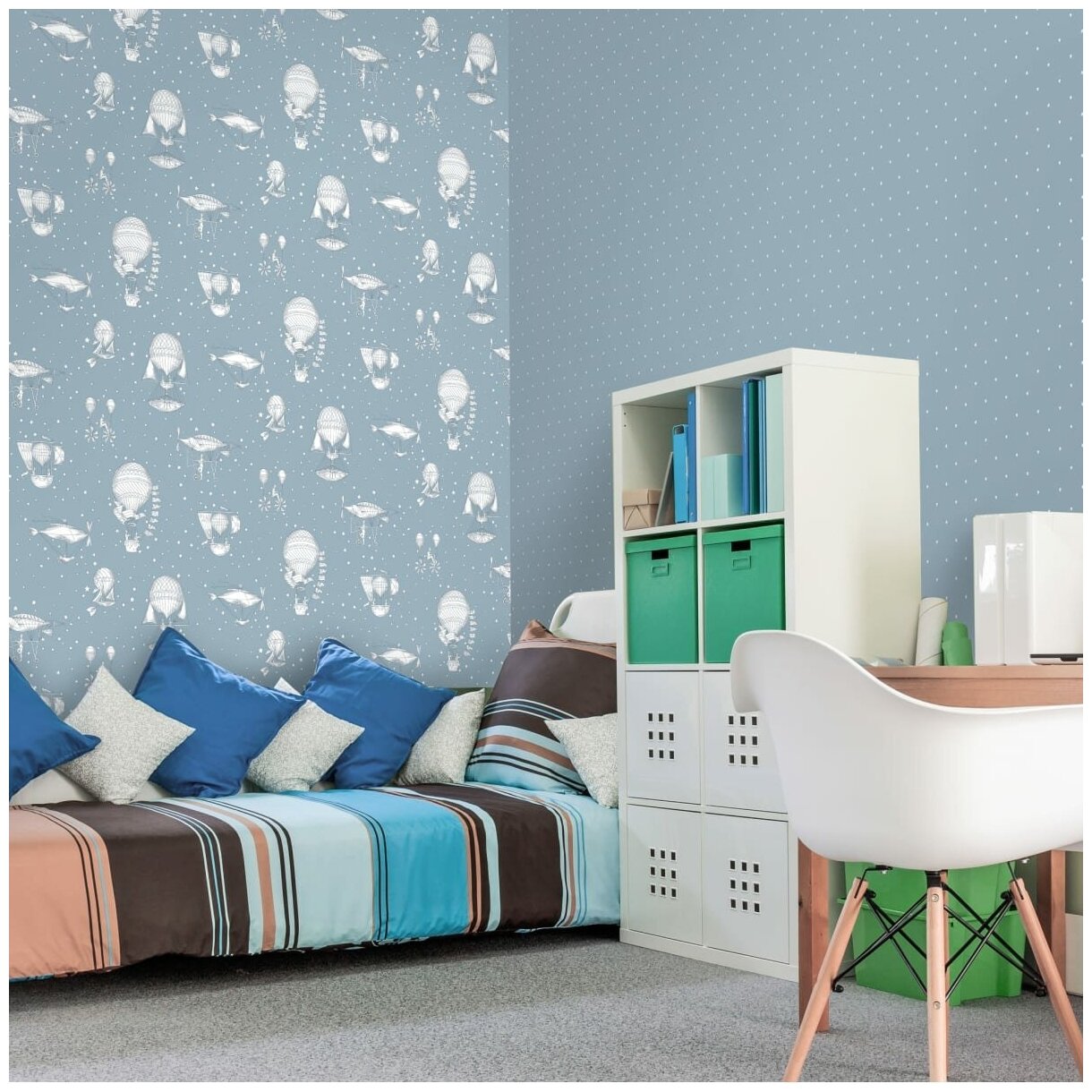 Виниловые обои с приятной матовой текстурой и интересными узорами в виде сказочных дирижаблей, понравятся как взрослым, так и детям. Такое покрытие лучше всего подойдет для оформления спальни или детских комнат. Приглушенный синий оттенок в сочетании с ненавязчивым рисунком белого цвета хорошо гармонирует с мебелью в светлой цветовой гамме. Обои данной серии добавят в атмосферу комнаты нотку уединения и спокойствия.