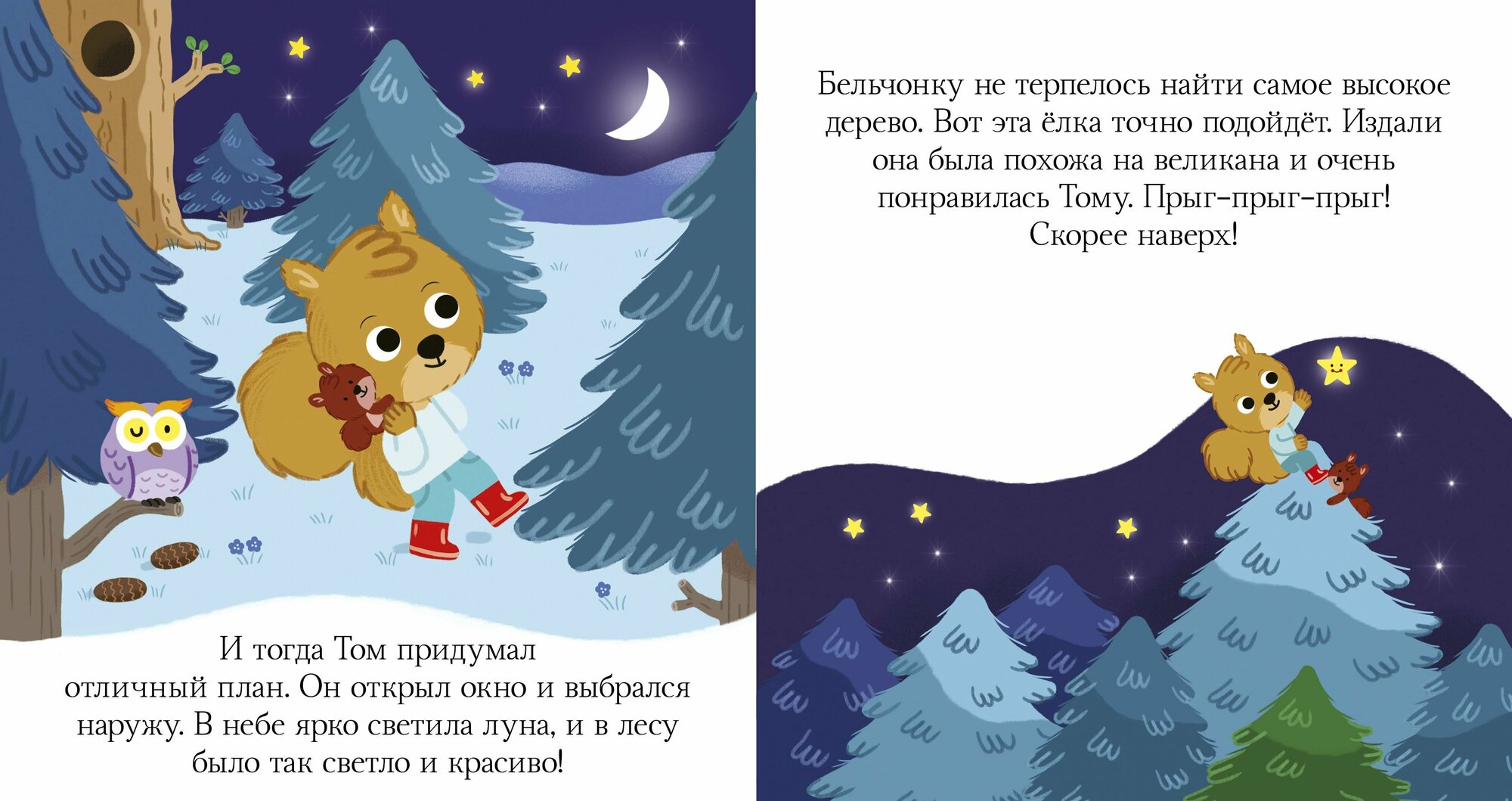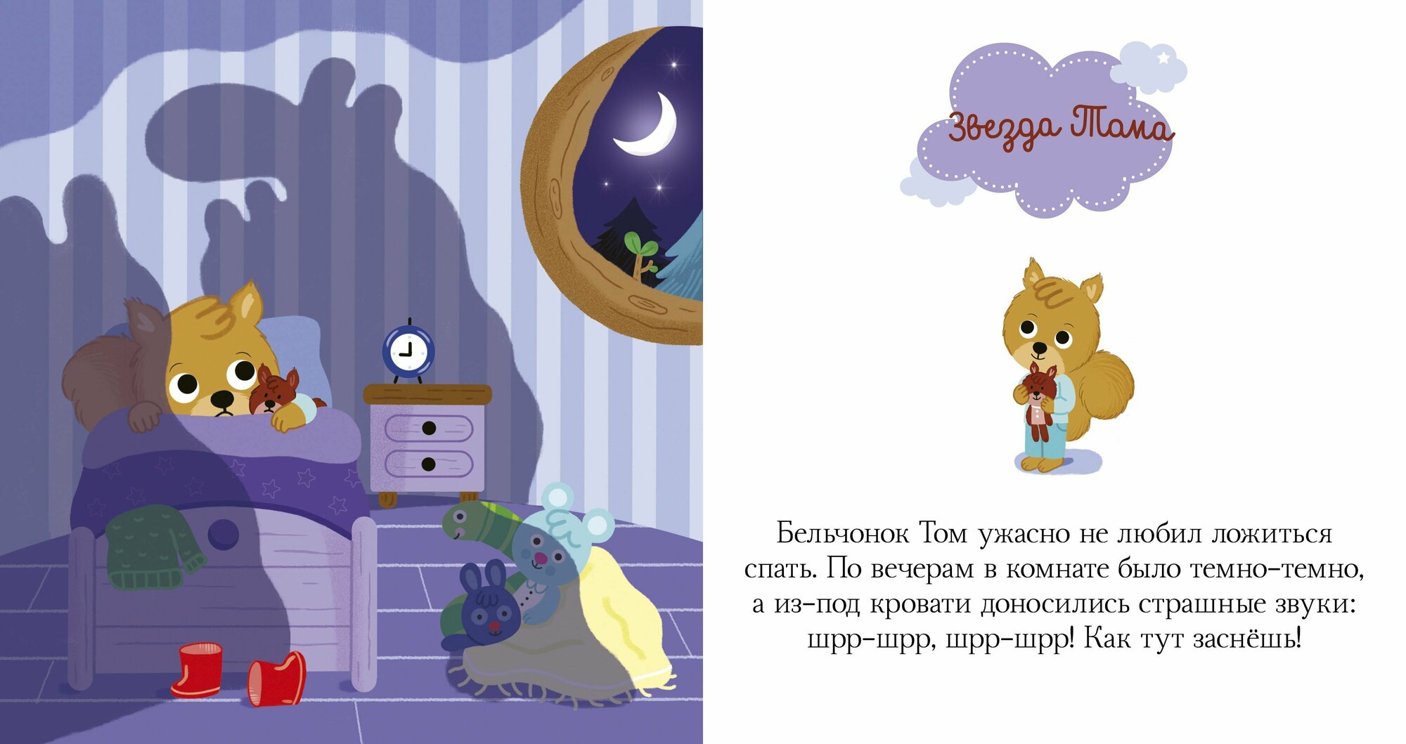"Бельчонок Том ужасно не любил ложиться спать. По вечерам в комнате было темно-темно, а из-под кровати доносились страшные звуки: шрр-шрр, шрр-шрр! Как тут заснешь!"
