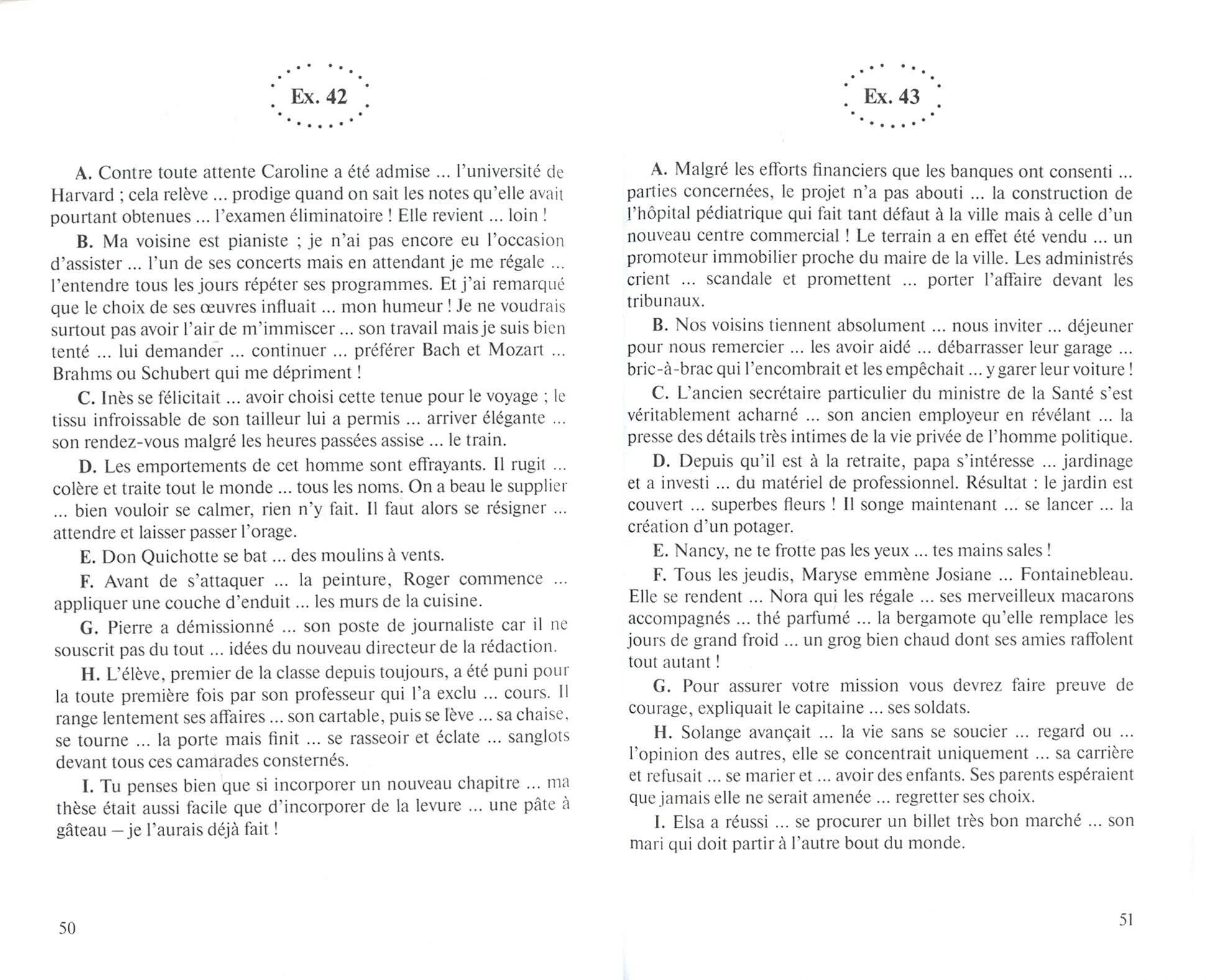 Бесспорно, для изучающих французский язык эта книга - просто клад. Достаточно большие упражнения на управление глаголов, упражнения на перевод с русского на французский, можно самому заниматься, потому что можно проверить себя по ответам. К сожалению, нет никакой, хотя бы небольшой, таблицы на глаголы с управлением - а это было бы неплохо.