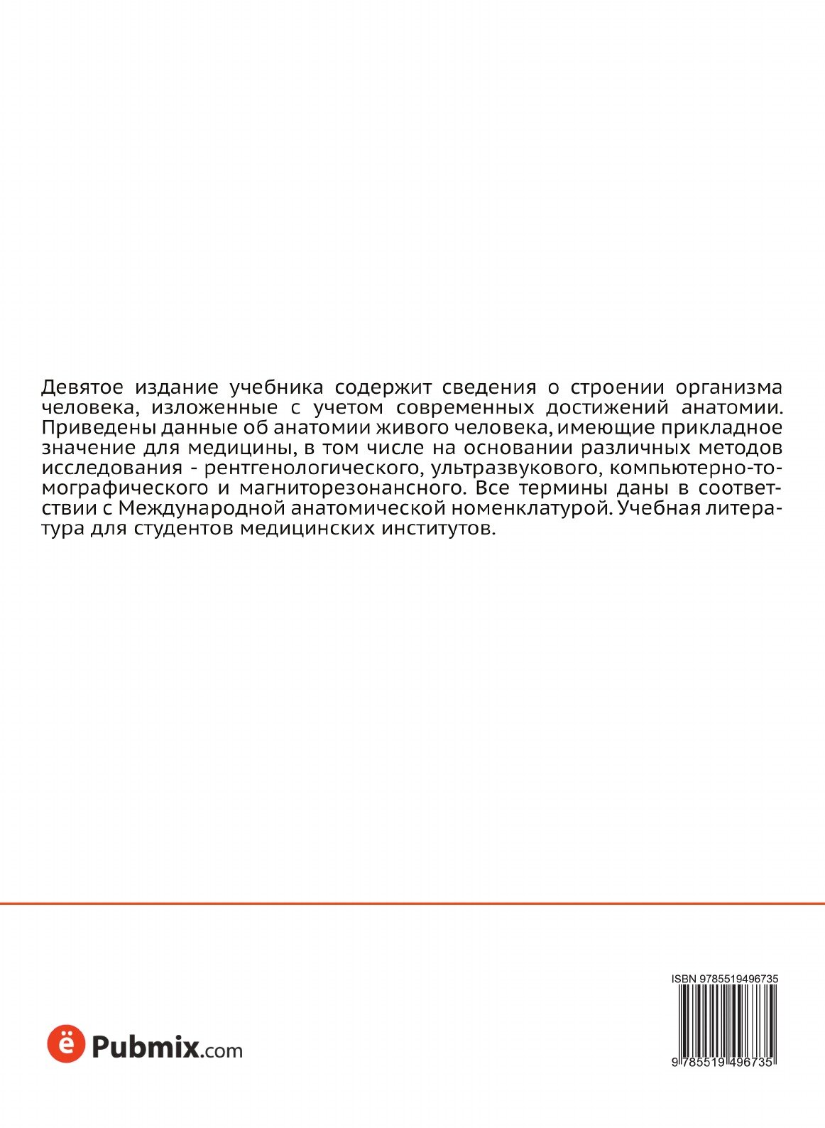 Девятое издание учебника содержит сведения о строении организма человека, изложенные с учетом современных достижений анатомии. Приведены данные об анатомии живого человека, имеющие прикладное значение для медицины, в том числе на основании различных методов исследования - рентгенологического, ультразвукового, компьютерно-томографического и магниторезонансного. Все термины даны в соответствии с Международной анатомической номенклатурой. Учебная литература для студентов медицинских институтов.