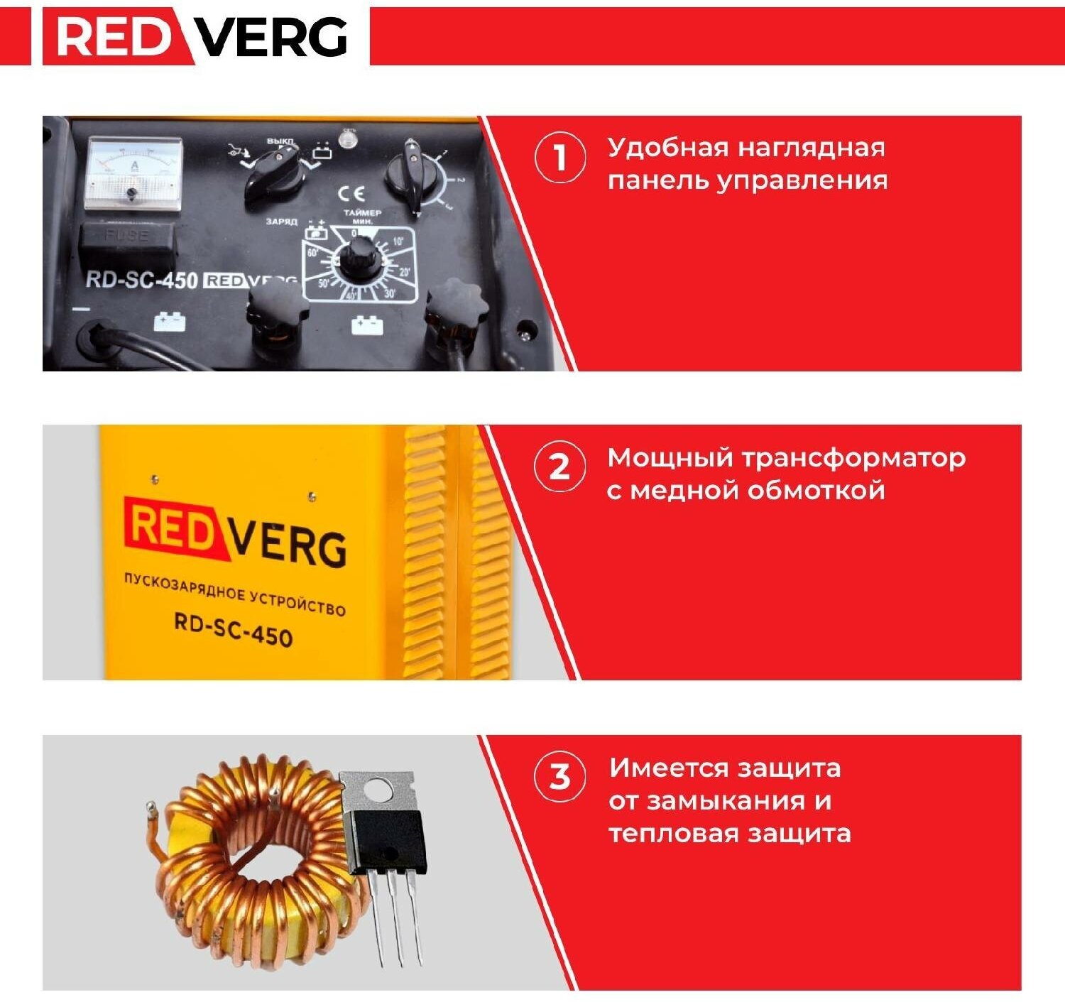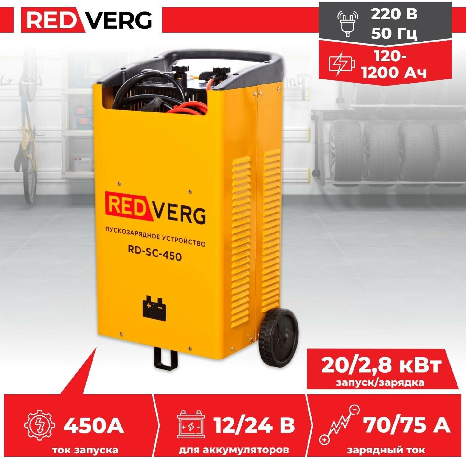 RedVerg — пуско-зарядное устройство, предназначенное для обслуживания различных видов аккумуляторов. Его отличительной особенностью является высокая мощность — 20 000 Вт в режиме запуска, которая обеспечивает эффективность даже при глубоком разряде.