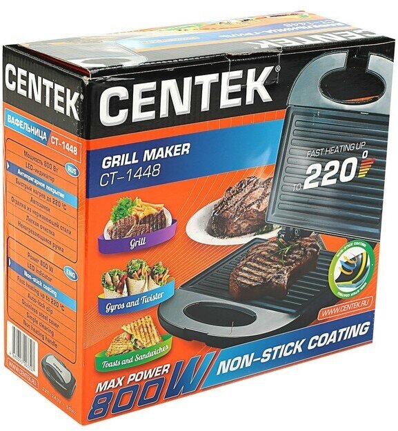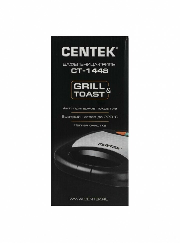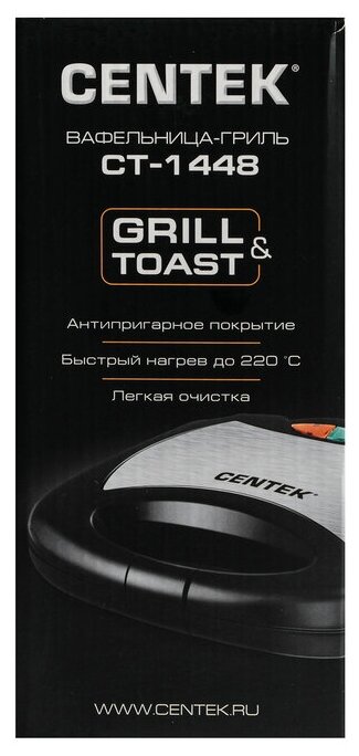 Вафельница-гриль Centek - оригинальный прибор для приготовления вафель, мяса, "Гирос", "Твистеров", тостов и сендвичей. Она способна быстро и качественно прожарить мясо, подрумянить хлеб для бутерброда или испечь вафли. С функцией быстрого нагрева до 220 вам не придется долго ждать готовности прибора к работе. Для удобства пользования в вафельнице-гриль Centek предусмотрен индикатор включения и индикатор работы, автозамок и ненагревающаяся ручка уберегут Вас от ожогов.