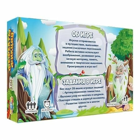 Фефекты фикции — увлекательная детская игра для развития речи и творческого мышления, разработанная профессиональными логопедами и детьми. Игроки отправляются в путешествие, выполняют задания сказочных персонажей. Ребята активно используют воображение, развивают речь, мелкую моторику, память, внимание и творческое мышление. Проигравших в игре нет! Вас ждут 26 видов игровых заданий (всего в игре более 350 заданий): Артикуляционная гимнастика. Выложи узор из палочек и шнурков. Повтори стишок. Дорисуй половинку узора. Исправь ошибку во фразе. Придумай предложение, используя заданные слова. Развитие ловкости. И многое другое. Игра направлена на комплексное развитие речи и интеллекта. В увлекательной игре ребенок с интересом учится не только произносить звуки правильно, но и изучает новые слова, активно использует воображение, развивает память, внимание и творческое мышление. В центре игрового поля располагается замок богатырей, который окружают четыре сказочные страны. В этих странах живут Баба Яга, Леший, Водяной и Змей Горыныч. Цель игры — обойти всех злодеев на карте, выполняя их задания, и вернуться в родной замок.