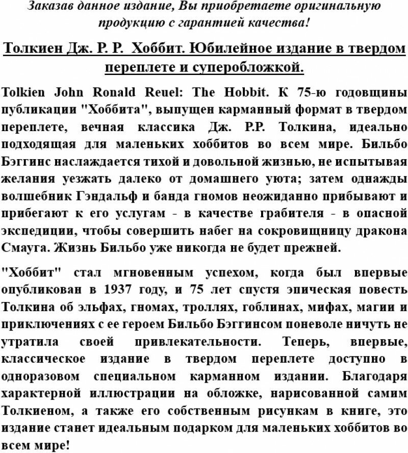Для изучения английского языка продвинутого уровня лучше выбрать эту версию книги. Она компактная, что позволяет брать её в поездку. Присутствуют чёрно-белые иллюстрации от Толкиена. Шрифт хороший, чёткий. Формат компактный, поэтому размер шрифта мельче обычно. Издание представлено в суперобложке, что продлевает срок жизни книги. Покупкой доволен. Всем рекомендую.