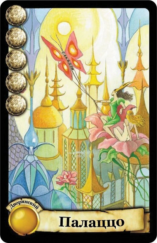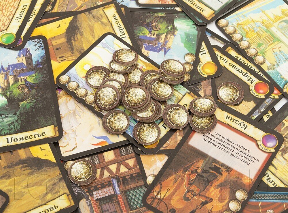 | Комплектация | 68 карт кварталов, 8 карт персонажей, 7 карт-памяток, 25 жетонов золота, 1 карта короны, правила игры |