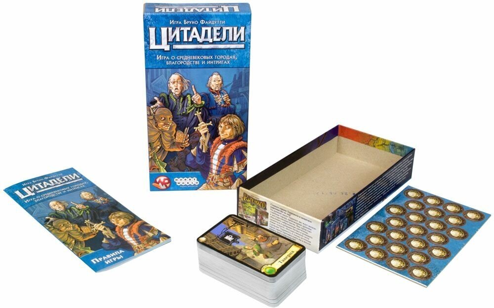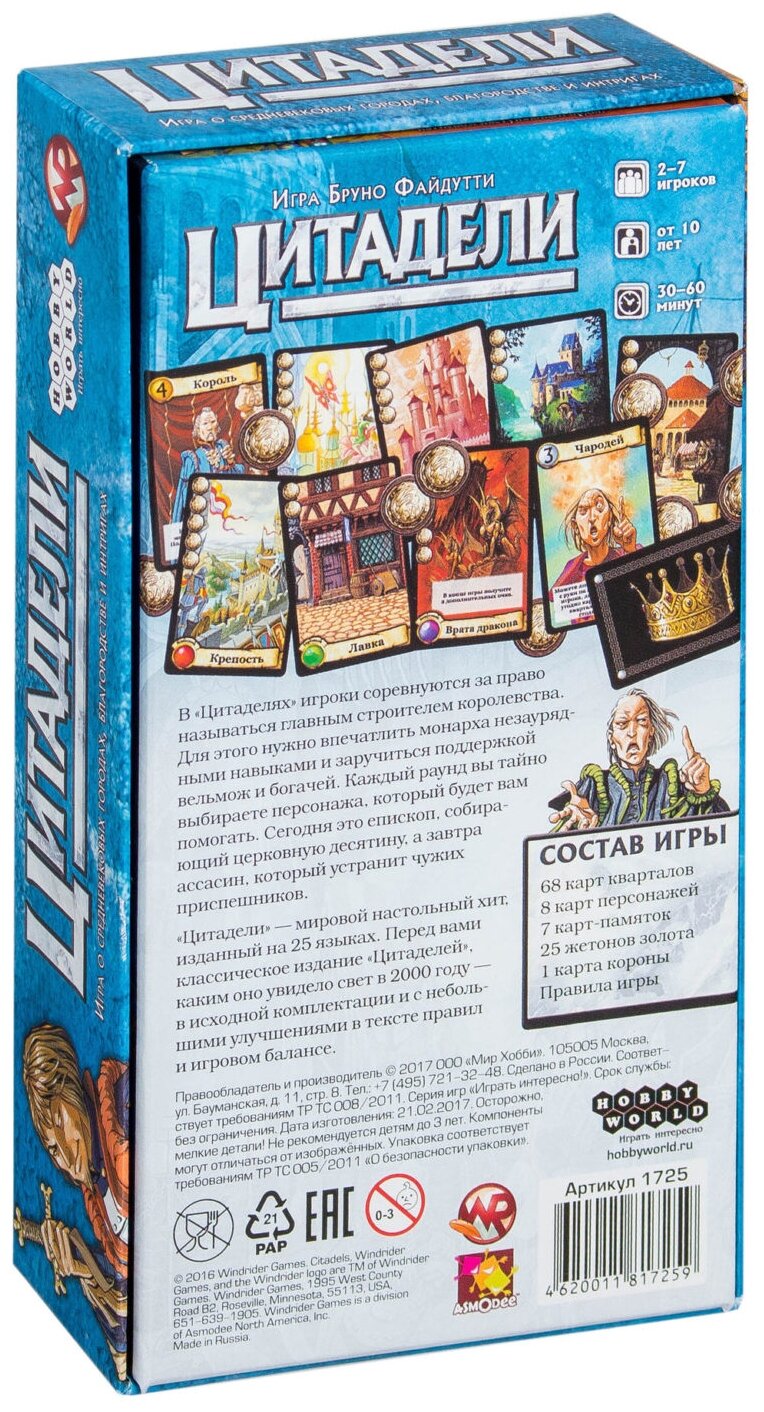 «Цитадели» — мировой настольный хит, изданный на 25 языках. Перед вами классическое издание «Цитаделей», каким оно увидело свет в 2000 году — в исходной комплектации и с небольшими улучшениями в тексте правил и игровом балансе.