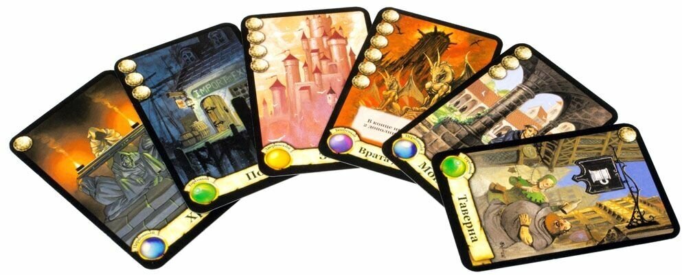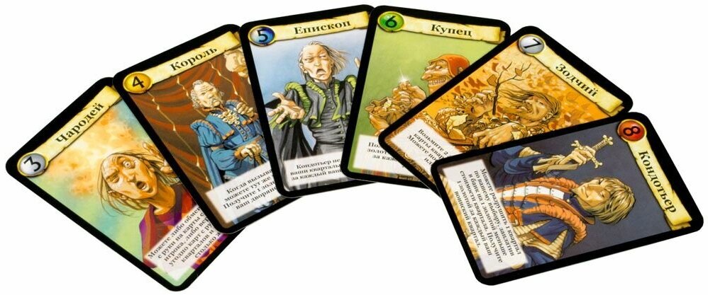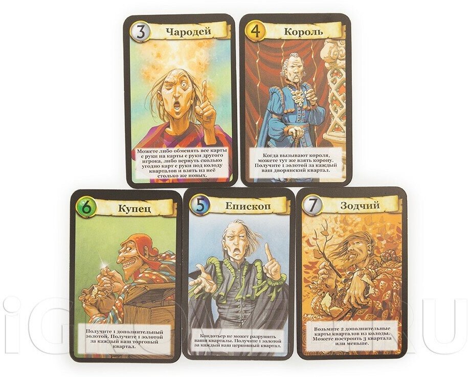 | Комплект игры | 68 карт кварталов, 8 карт персонажей, 7 карт-памяток, 25 жетонов золота, 1 карта короны, правила игры |