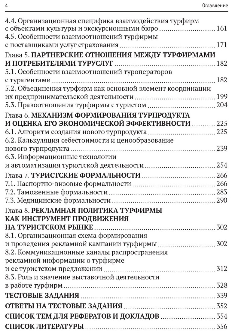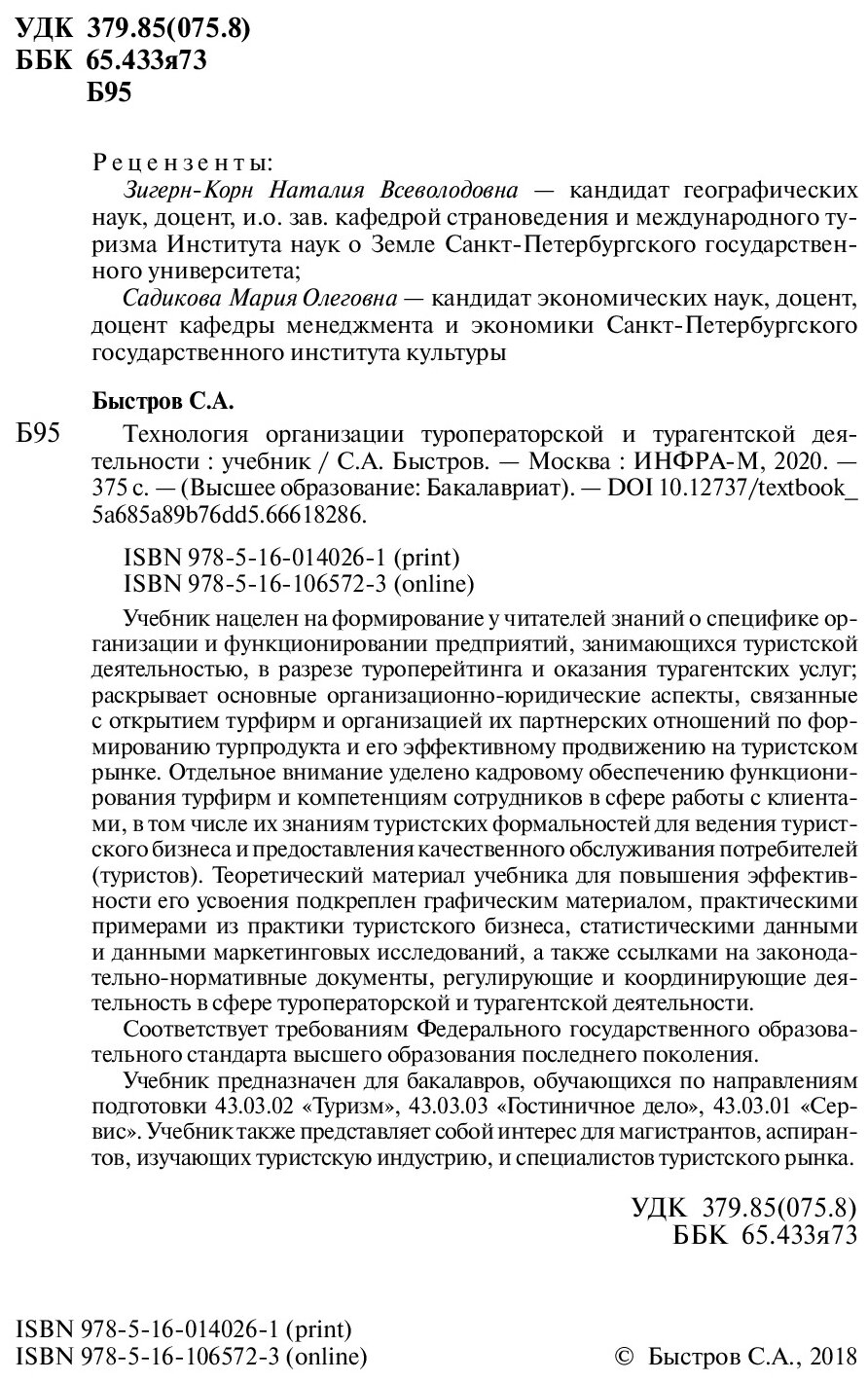 Учебник нацелен на формирование у читателей знаний о специфике организации и функционировании предприятий, занимающихся туристской деятельностью, в разрезе туроперейтинга и оказания турагентских услуг; раскрывает основные организационно-юридические аспекты, связанные с открытием турфирм и организацией их партнерских отношений по формированию турпродукта и его эффективному продвижению на туристском рынке. Отдельное внимание уделено кадровому обеспечению функционирования турфирм и компетенциям сотрудников в сфере работы с клиентами, в том числе их знаниям туристских формальностей для ведения туристского бизнеса и предоставления качественного обслуживания потребителей (туристов). Теоретический материал учебника для повышения эффективности его усвоения подкреплен графическим материалом, практическими примерами из практики туристского бизнеса, статистическими данными и данными маркетинговых исследований, а также ссылками на законодательно-нормативные документы, регулирующие и координирующие деятельность в сфере туроператорской и турагентской деятельности. Соответствует требованиям Федерального государственного образовательного стандарта высшего образования последнего поколения. Учебник предназначен для бакалавров, обучающихся по направлениям подготовки 43.03.02 «Туризм», 43.03.03 «Гостиничное дело», 43.03.01 «Сервис». Учебник также представляет собой интерес для магистрантов, аспирантов, изучающих туристскую индустрию, и специалистов туристского рынка.