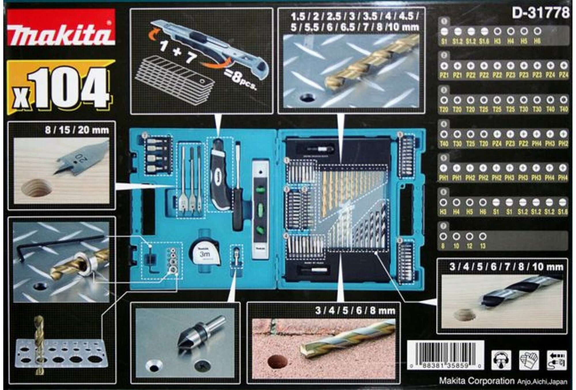 | Прочие особенности и свойства | Набор Makita D-31778 может быть использован практически где угодно:дома, в мастерской, в строительстве и т.д. Набор универсален и позволяет выполнять большое количество различных работ. Поставляется в удобном пластиковом кейсе, благодаря которому все и всегда будет под рукой и в идеальном порядке. |