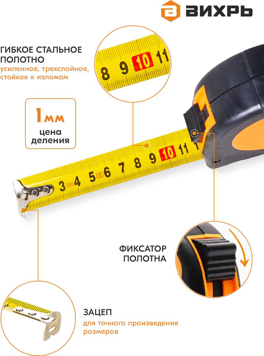 **Рулетка Вихрь** подходит для выполнения различных замеров. Корпус из ударопрочного пластика не боится падений, не деформируется и не скалывается. Большие контрастные цифры позволяют легко определить показания измерений.